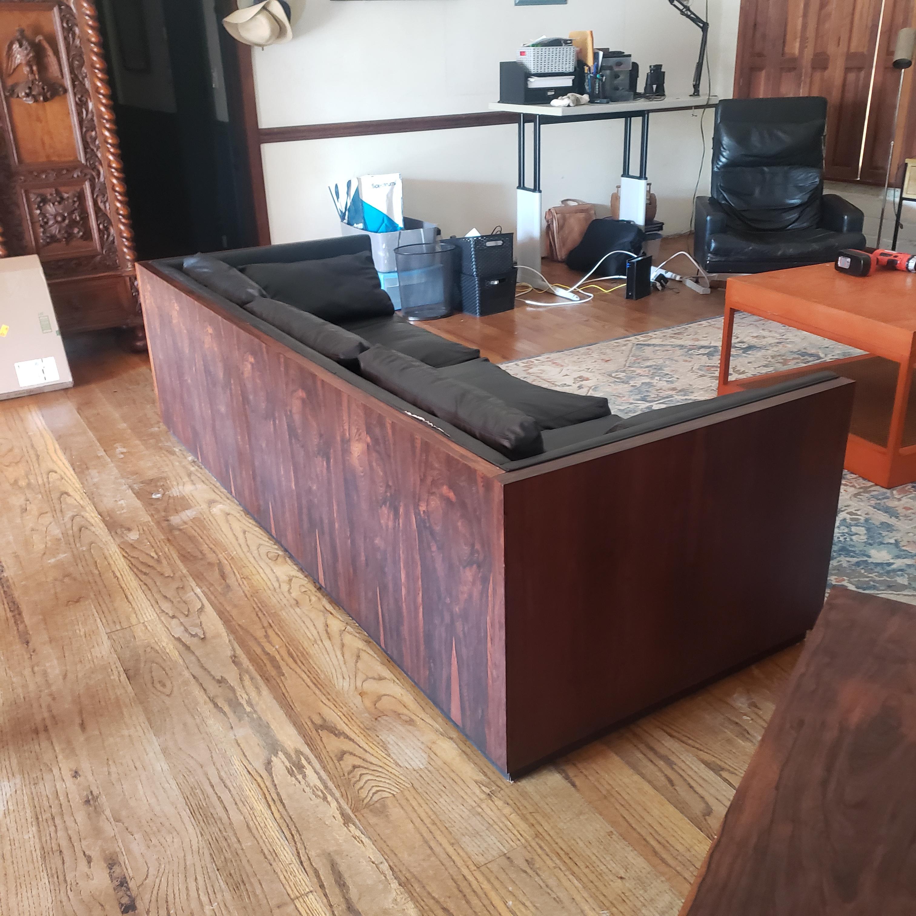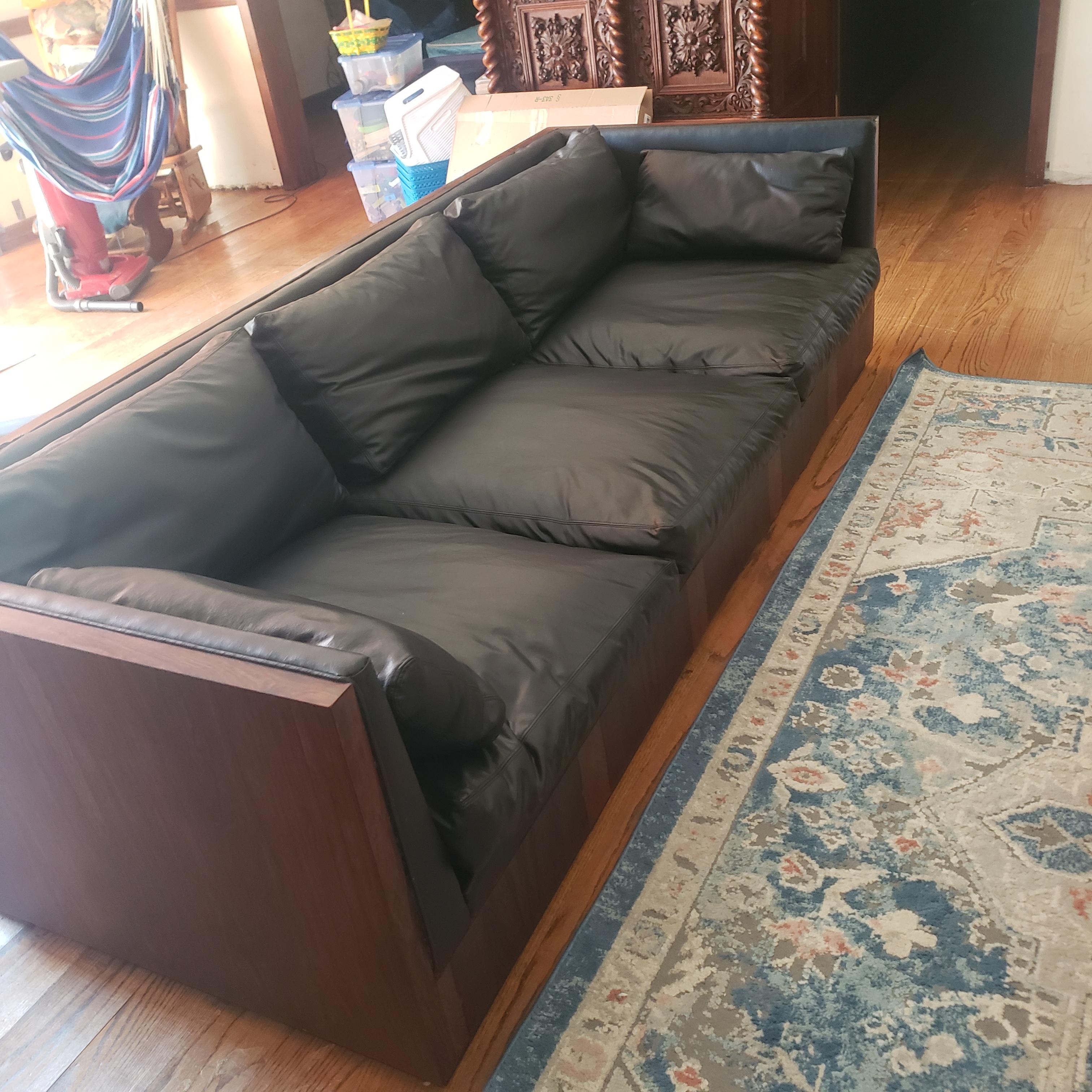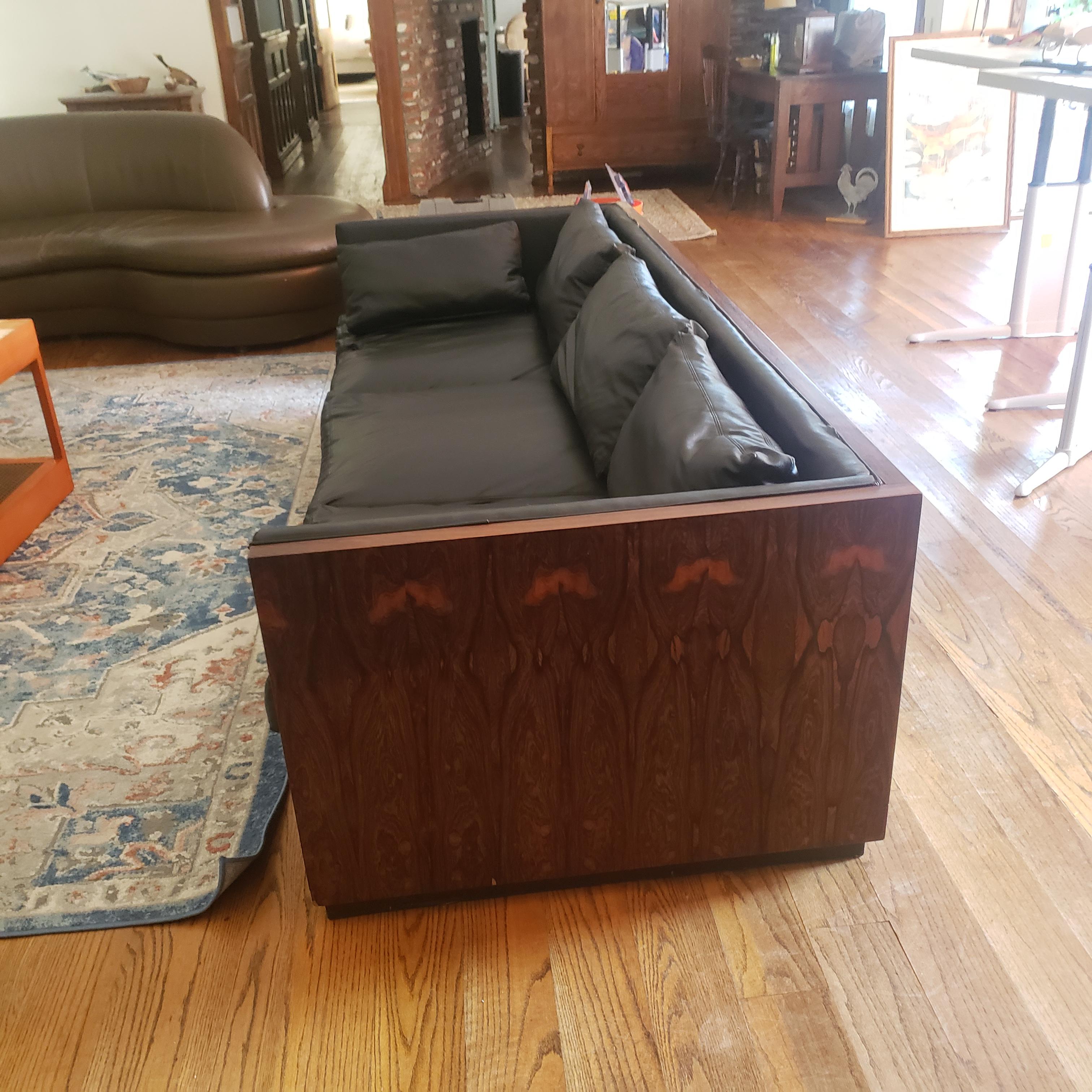 Milo Baughman black leather and rosewood case sofa. Small damage at bottom side to veneer.