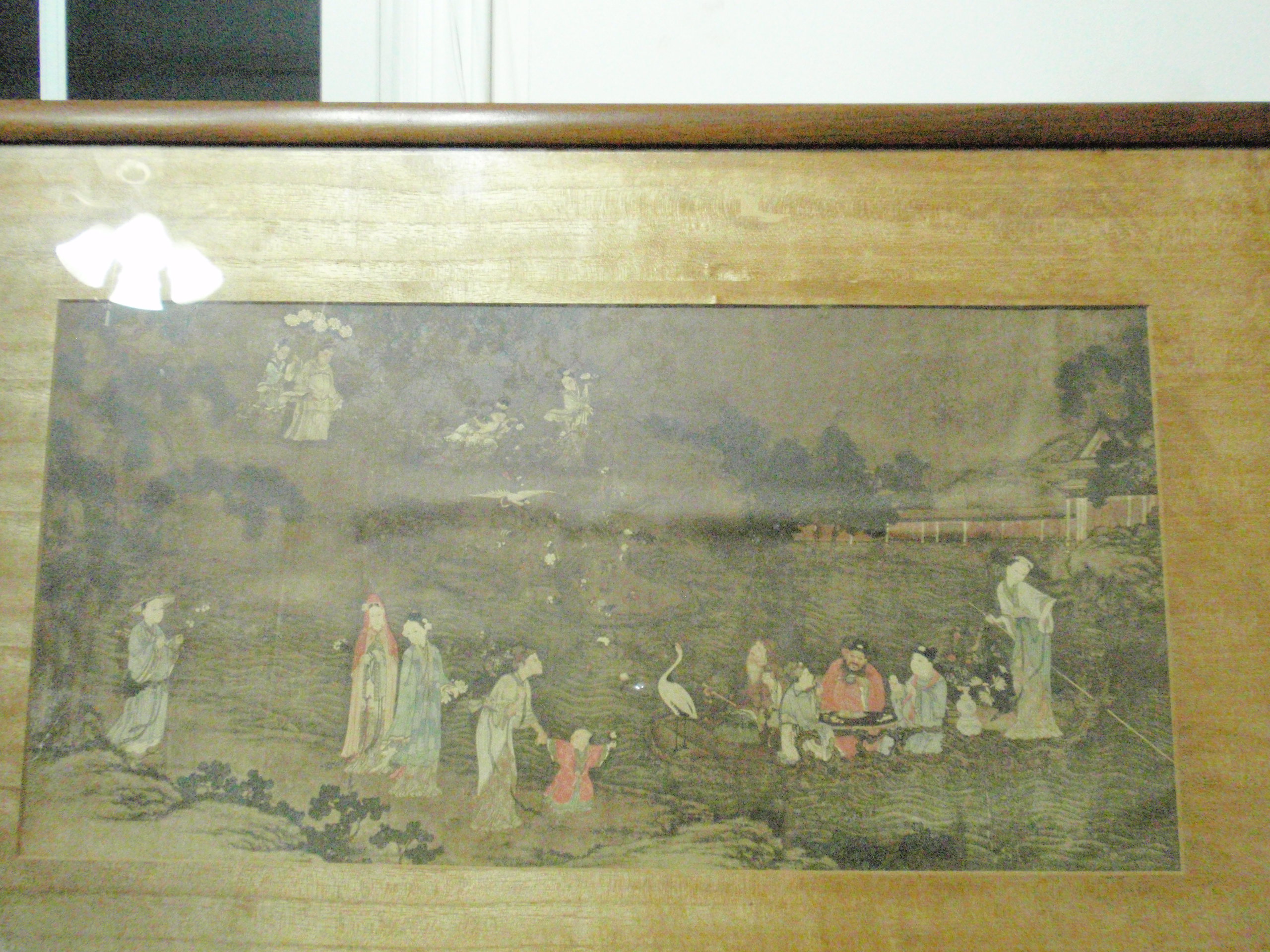Pictured is a framed picture covered by glass. This asian theme picture is 19 x 10". There is some old mold on the inside of the glass.