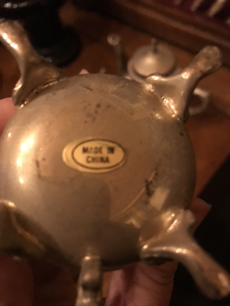 This tiny silver tea set includes a 5" tall tea server along with 2" creamer and sugar bowl with lid. The bottom sticker states "Made in China".