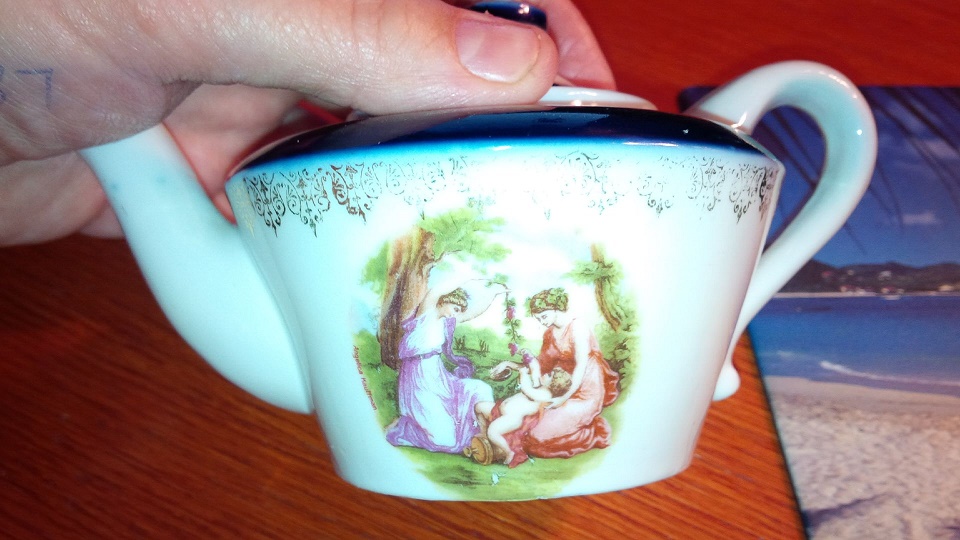I found this little beauty at a local thrift store. I was doing some research and found some other things with Angelica Kauffman's name on it and it seems she is highly collectible. However, I was unable to find anything like this little teapot. I have no clue if this is authentic or what...I do want to sell it so i would like to have an accurate price for this little gem. It really is very cute. The pictures do not do it justice. The only chip I found was on the mouth of the spout, just a chip off. There are no cracks or chips anywhere else. Some of the gold filigree is fading. Other than that, this piece is in good shape. Any help here would be awesome!! Thank you in advance!