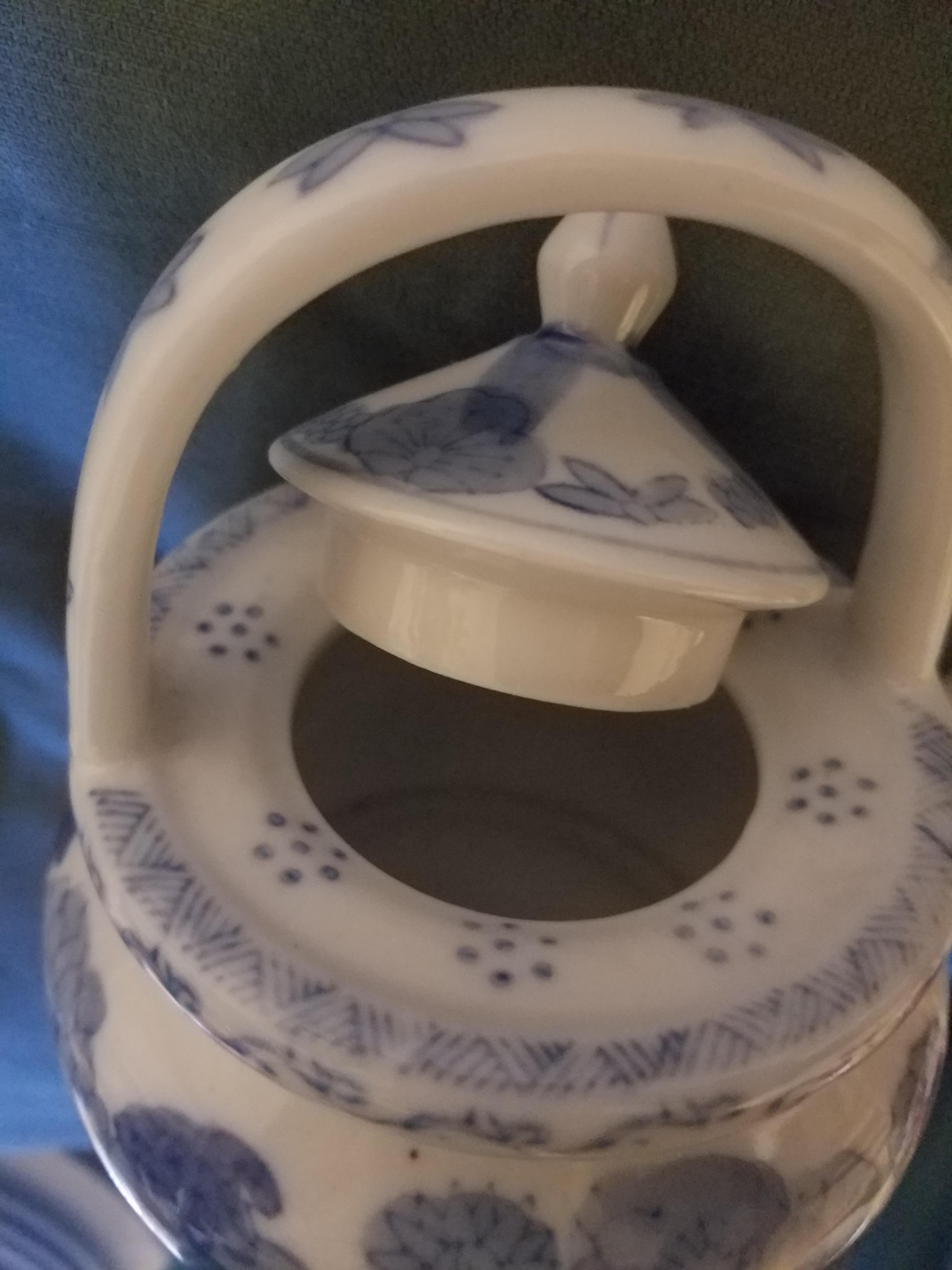 This appears to be a 3 inch, just body, porcelain white & faded blues flower pattern. Little scrolls on bottom foot, different scrolling around rim where lid goes, The top of the teapot where lid is, surrounding opening of lid it appears like a weave pattern, then closer to lid opening around the top 7 dots in clusters, 8 clusters. the lid itself blue faded ring around it, 4 faded bigger flowers followed by 4 leaf, then 2 baby flowers overlaping each other. 4 faded blue brush ups to base of tip, tip is as a bulb heavey base tappered to a point. The porcelain handle across the top has a simple pattern of the 4 leaf that appears 3 times on the lid itself. Spout is rounded on bottom tappered tosmaller at tip of spout. spout has cluster of assorted blue floral print, the 4 leaf pattern, 2 of them. bigger blue flower then what could be grapes - The bottom of the pot says Made In China in blue ink. Thank You!