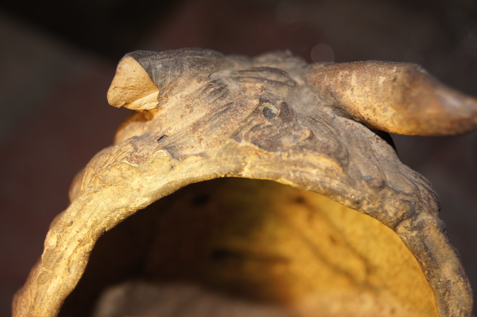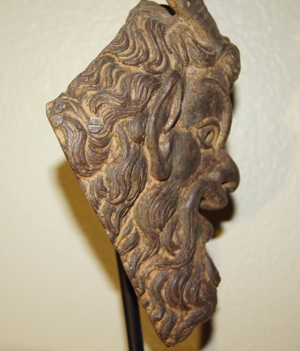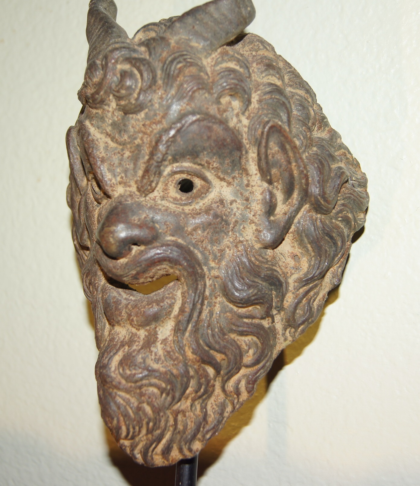 Mini Terricotta Mask of Pan from Austria.  I can't really tell if its actually Terricotta or not but I did notice small residue of rust particles (dark spots throughout).  Any idea's?