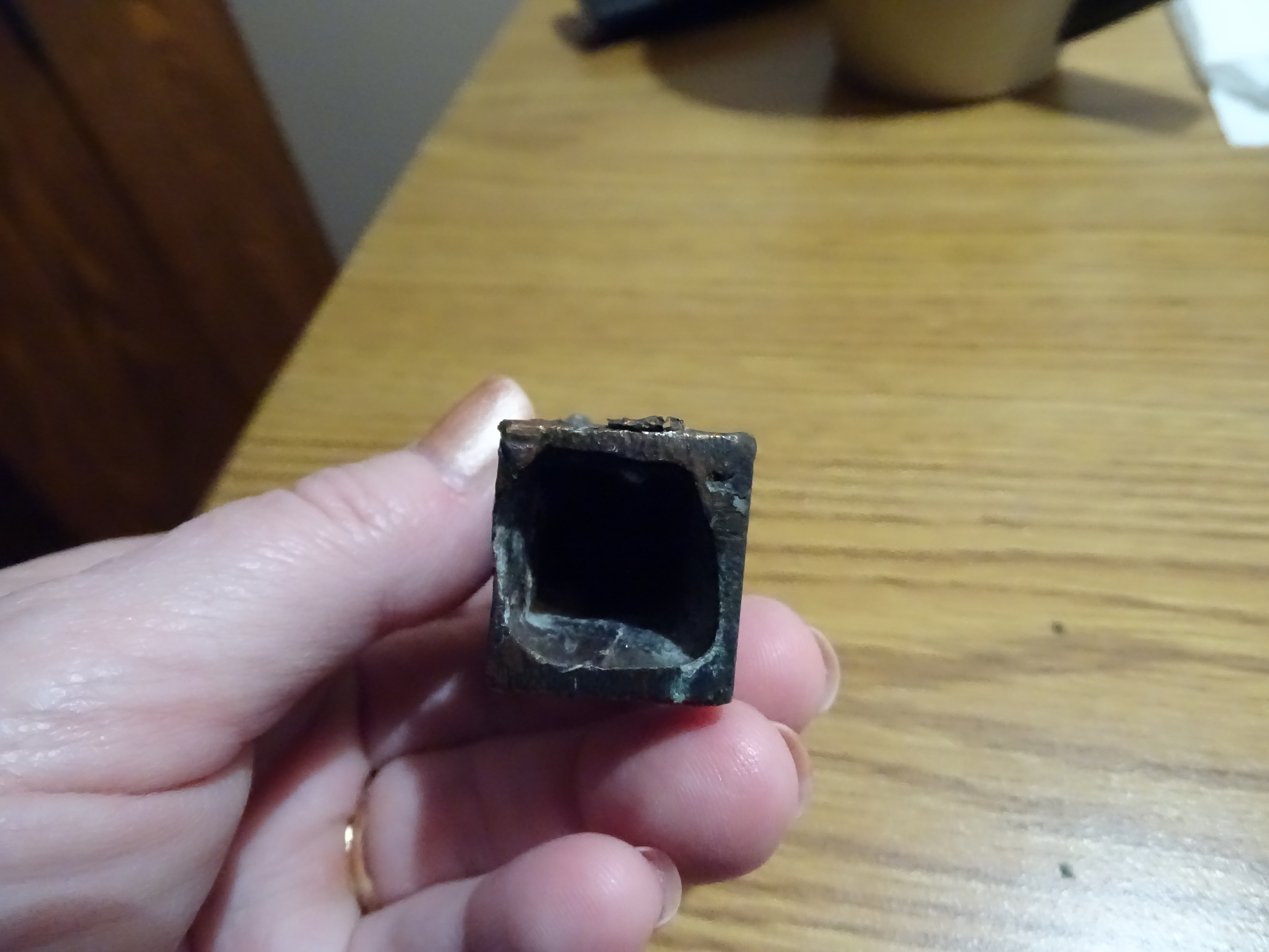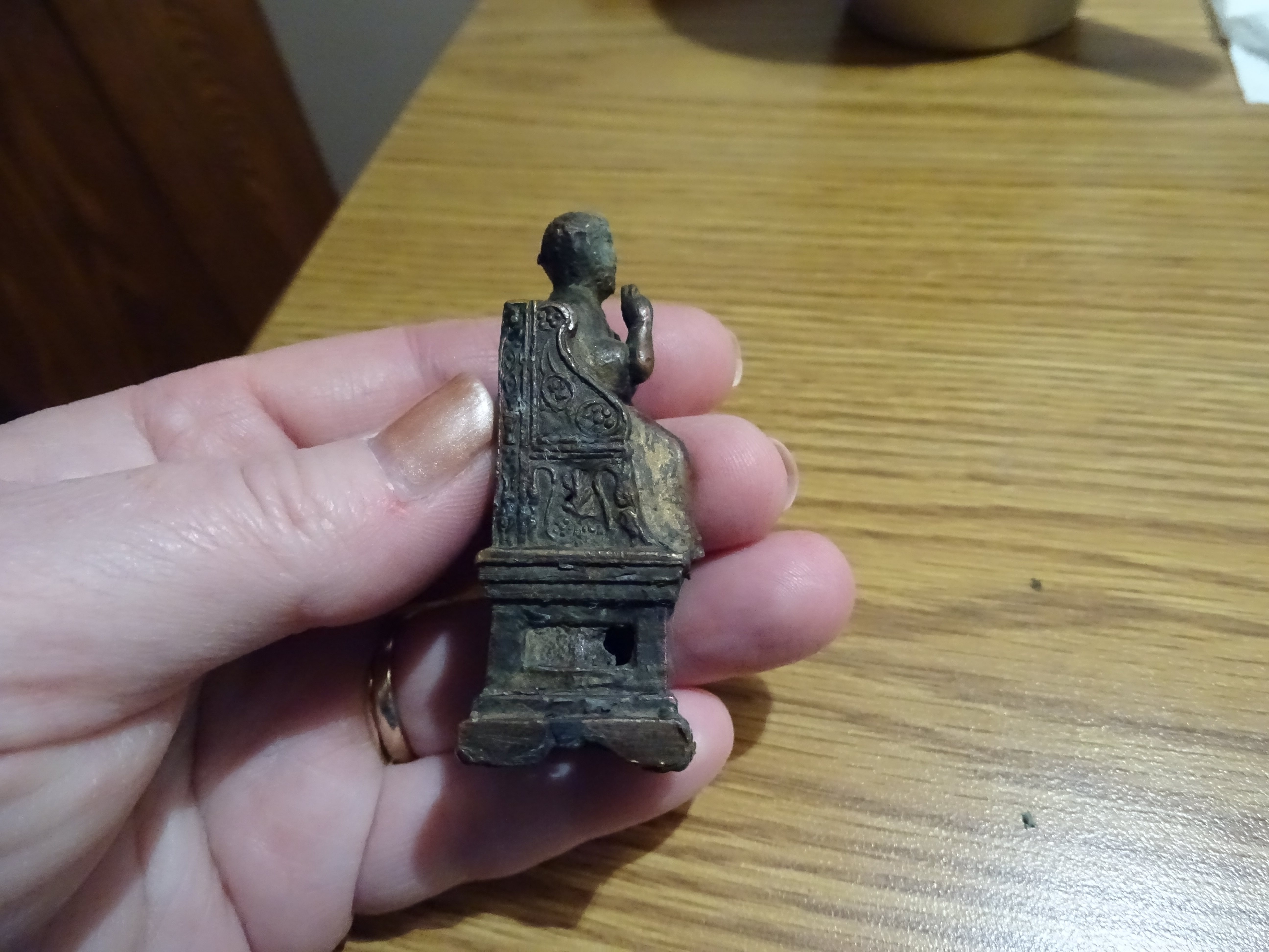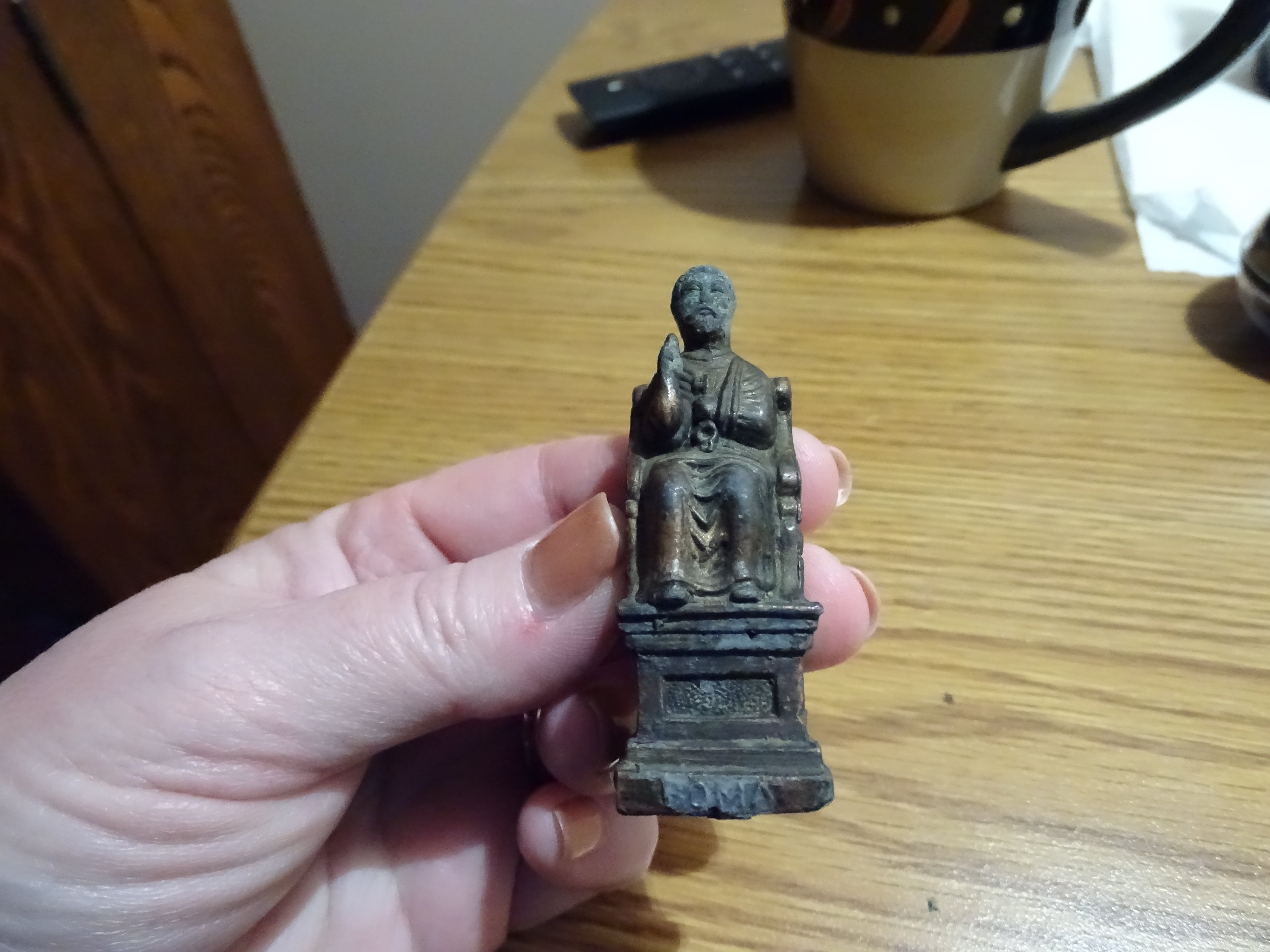 Small Copper statue of a man sitting on a raised chair holding a key. His left arm is in a sling. It appears he is genturing with his right hand. Some letters are peeling off the front and appeared to spell the word ROMA. Non-magnetic.