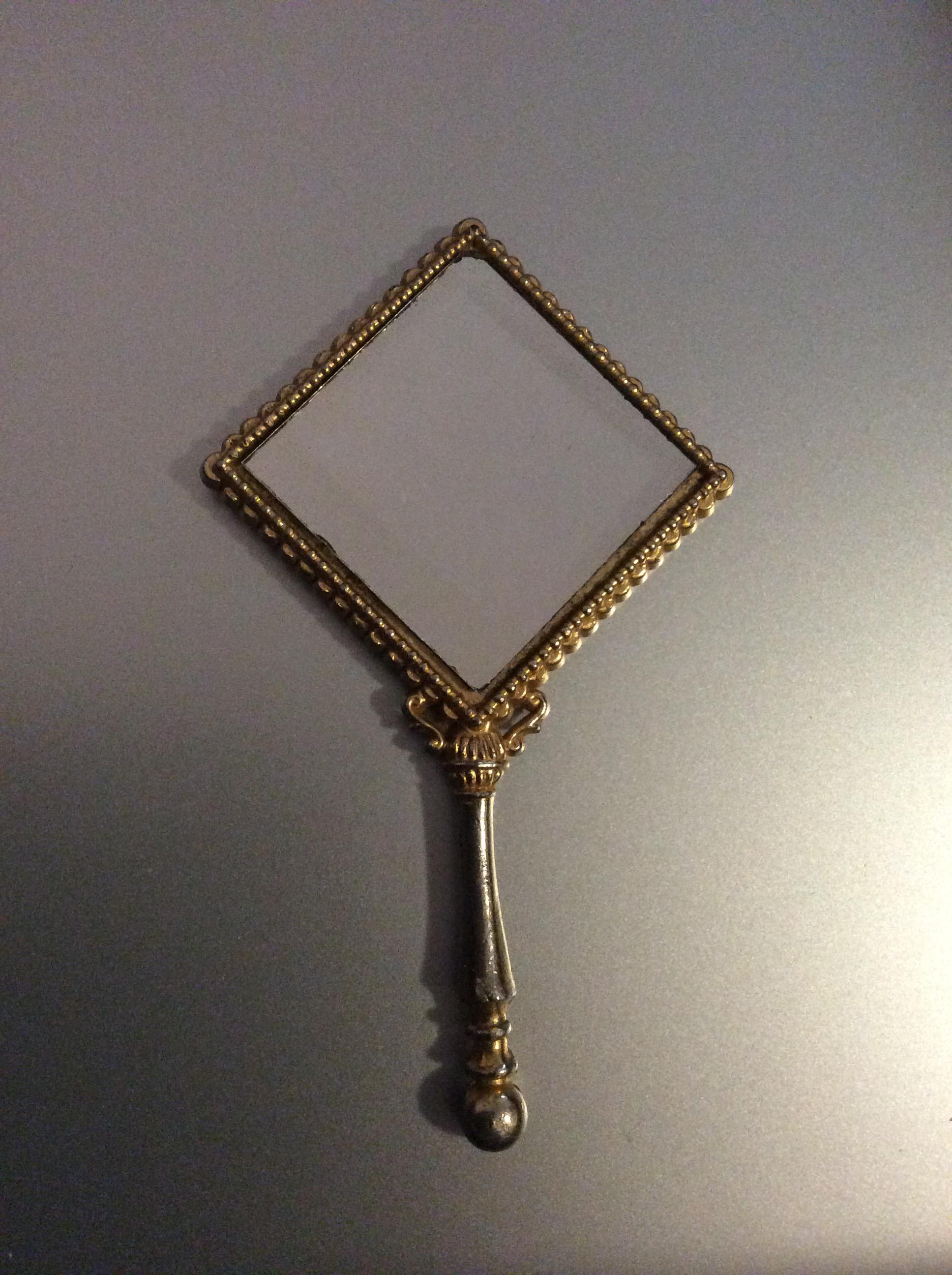I would like to know more about this mirror I purchased at a local antique store a while back. It is very small for a handheld mirror you can’t grip it like you would a vanity set mirror. Its got this red material on the other side, but I cannot figure out what it is. Any ideas as to what the material is and a time frame are welcomed as well as any questions! Thank you!