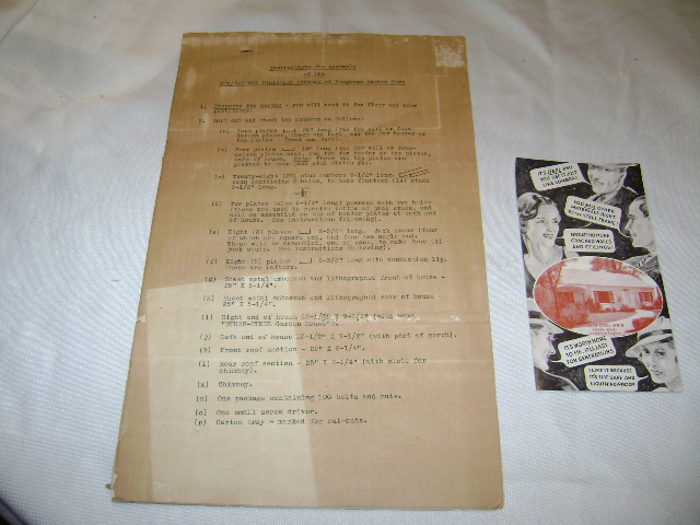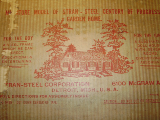 The piece is made from tin lithograph. It is unassembled. The individual pieces were wrapped in some sort of old "parchment paper" for the leack of better words. All of the screw s and nuts are present, as well as all the individual pieces. The Chimney is included too. The box reads: Miniature Model of Stran -Steel Century of Progress Garden Home. The instructions read: Stran- Steel Miniature Century of Progree Garden Home. I hav found information on the real house that was feature at the 1933 Chicago's World Fair, however I can not find any information on this top/dollhouse/erector set. Oh...as I was unwrapping the pieces to photograph it..I spotted a copywrite by The mathews Co, Detroit MI. Would like to know the value.