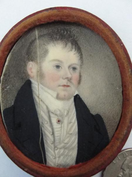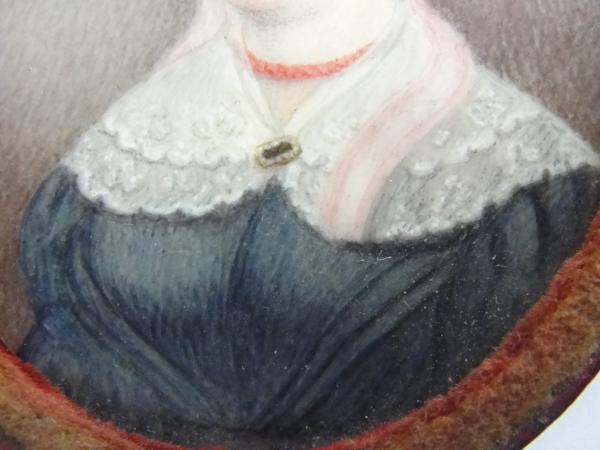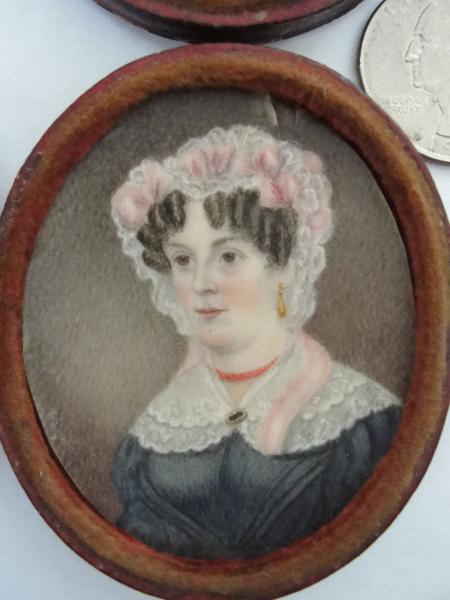 They are both in wooden cases, one is missing the hinge pin. The male is cracked and had been attached to a heavy paper backing and is missing the glass cover. The female has a glass cover. There is a little spot above her head.