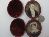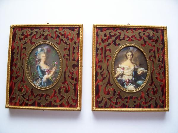 Two miniature paintings. I believe the miniatures are painted on ivory and that the frames are tortoise shell with brass inlay. They also have the raised or bubble glass covers.