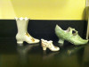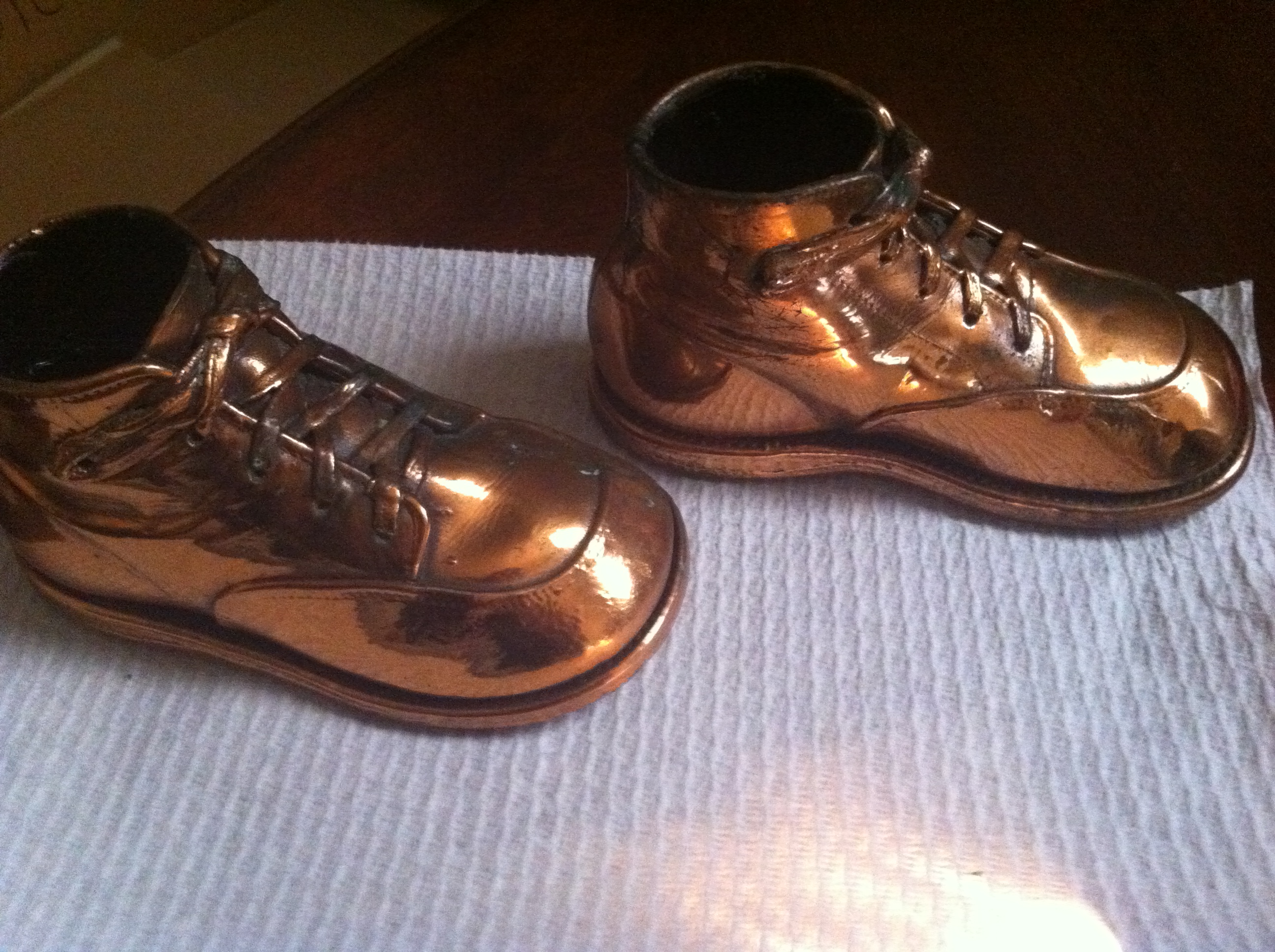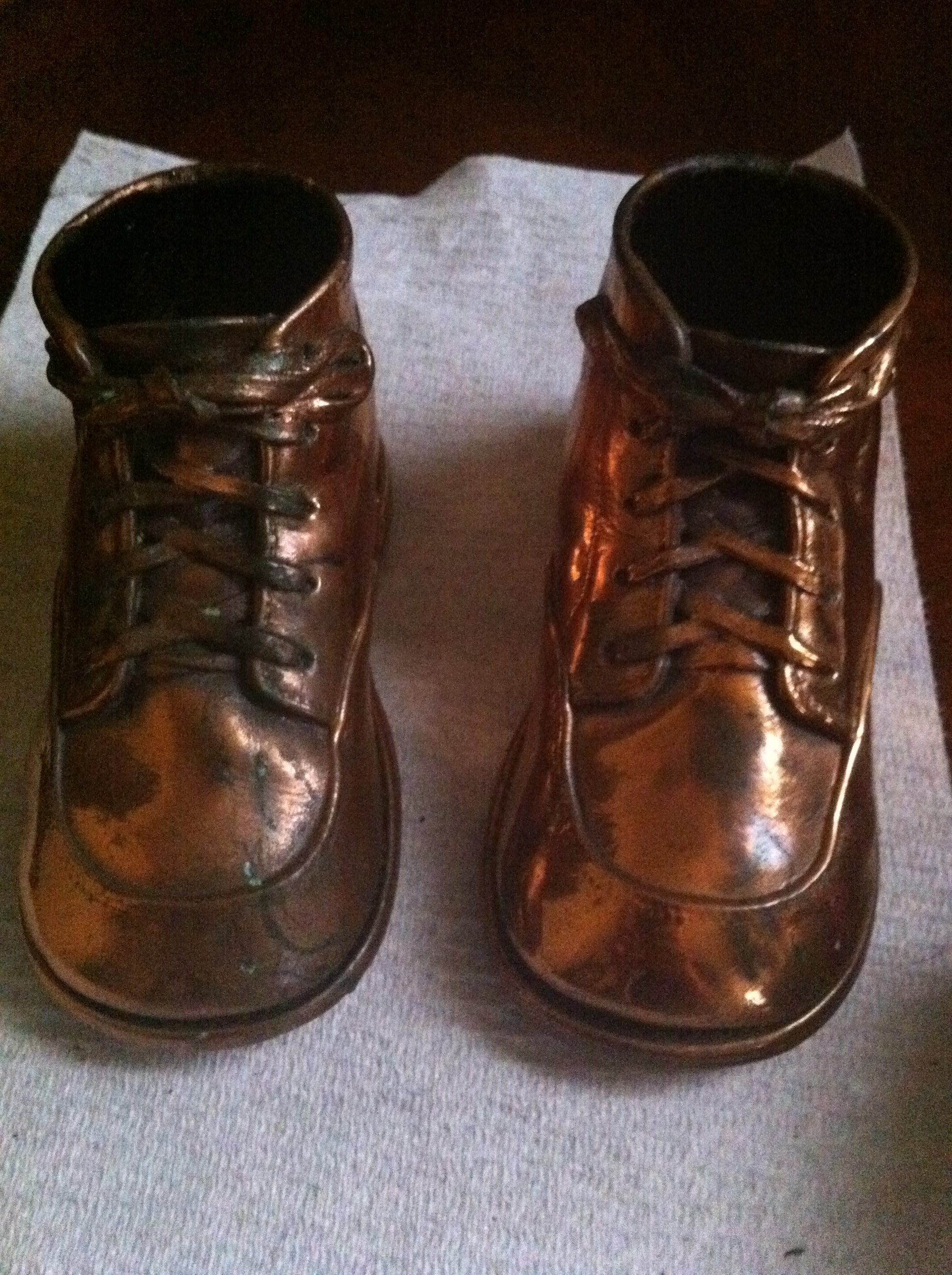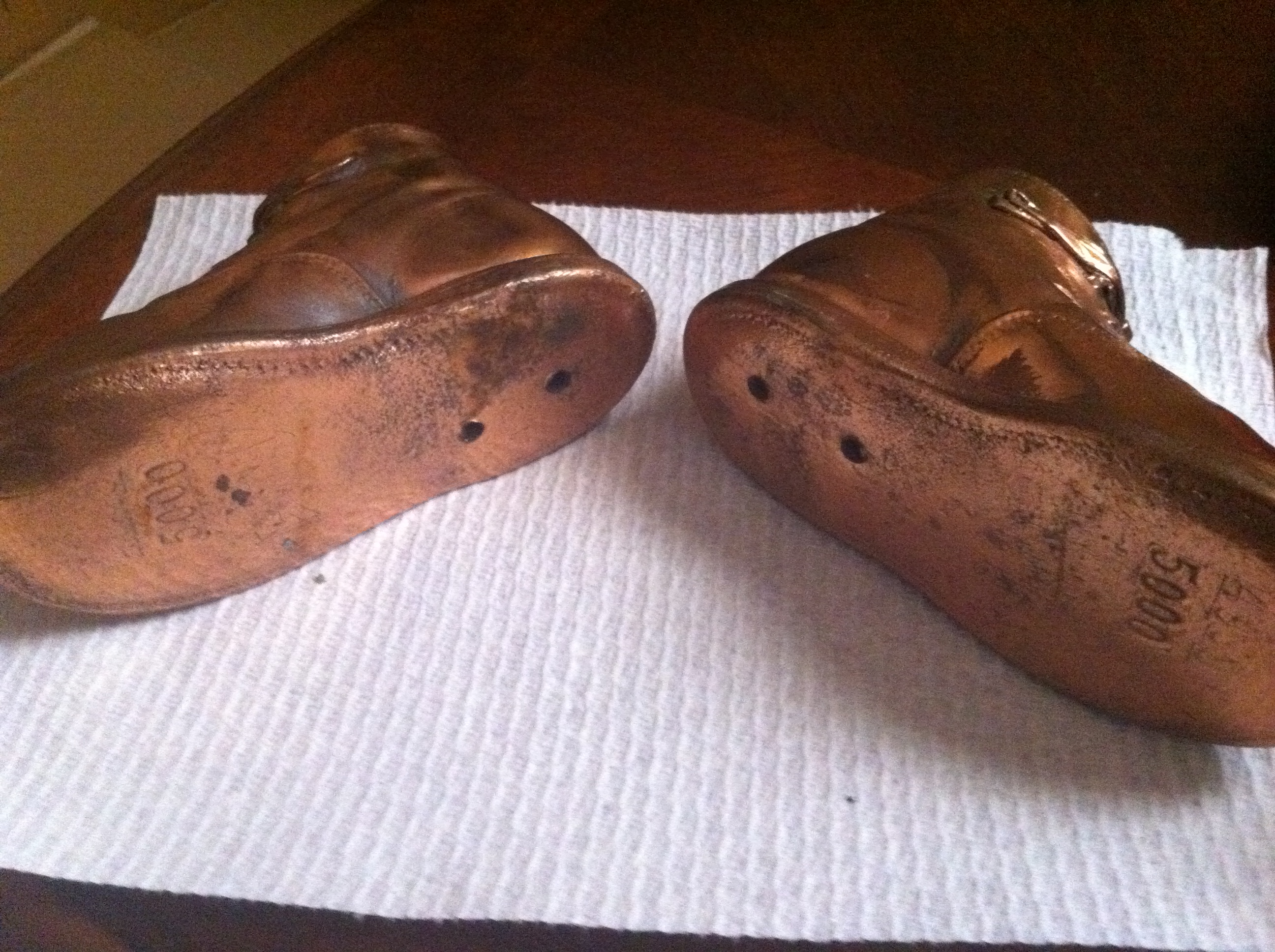 There are 2 holes on each of the heels (see pictures) which makes me think these were originally attached to legs of something. The bottom of the shoes also have a 5000 imprint on them with a very slight 4999 imprint right above the 5000. I'm not sure if it will show up on the picture, but it is there.