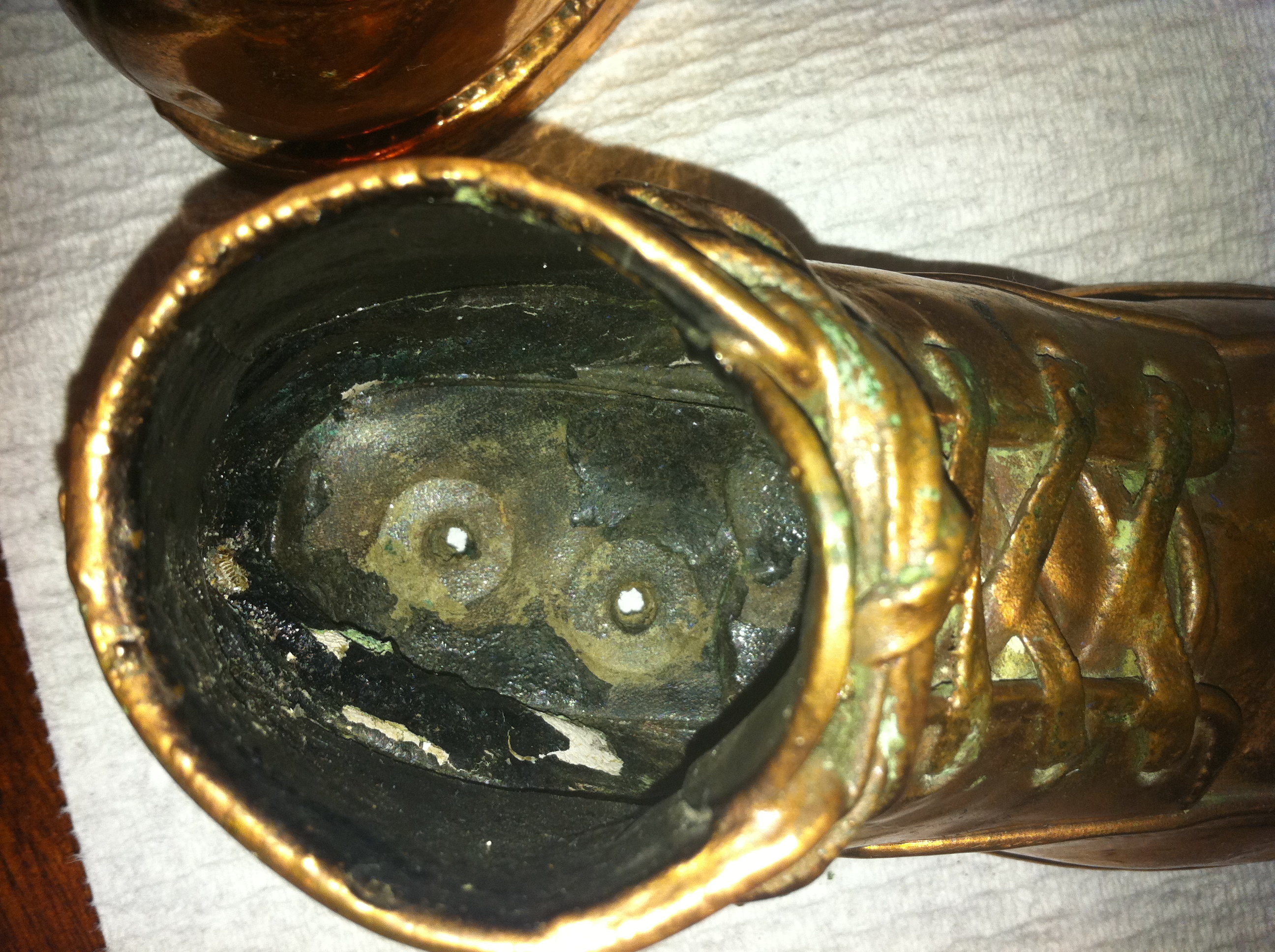 I have a pair of mini copper looking shoes. The outside is a copper color with very little wear except green spots seem to be coming up around the shoelaces. The inside seems to be black mostly and has more wear than the outside.