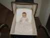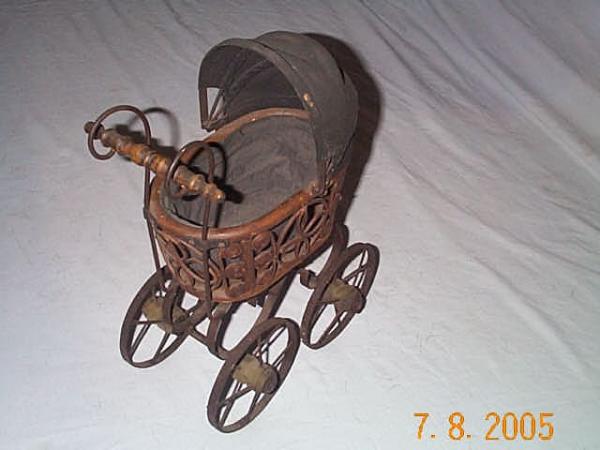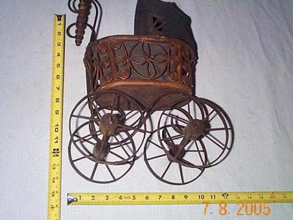 I have tried researching this before without luck. It is made of some kind of grapevine type material. The wheels look to be hammered as do the springs. It is lined with a black cloth material which matches the top. The top looks like it would go up and down but I was afraid of breaking it so didn't try. I list it as a toy but two different people suggested that it was a salesman's sample.