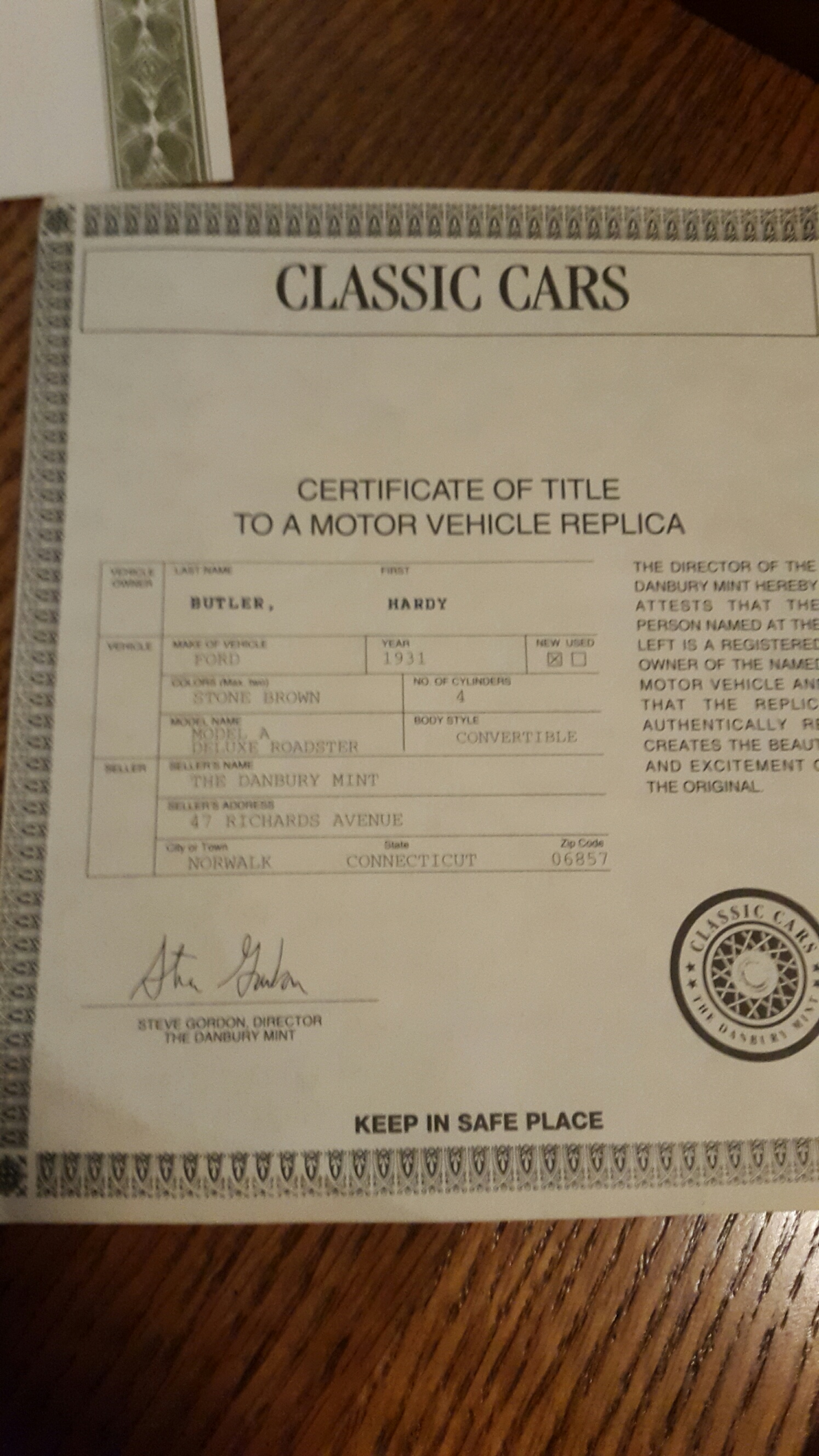Have a certificate of title and car from Danbury Mint for a 1931 Ford Model A Deluxe Roadster Convertible in Stone Brown.