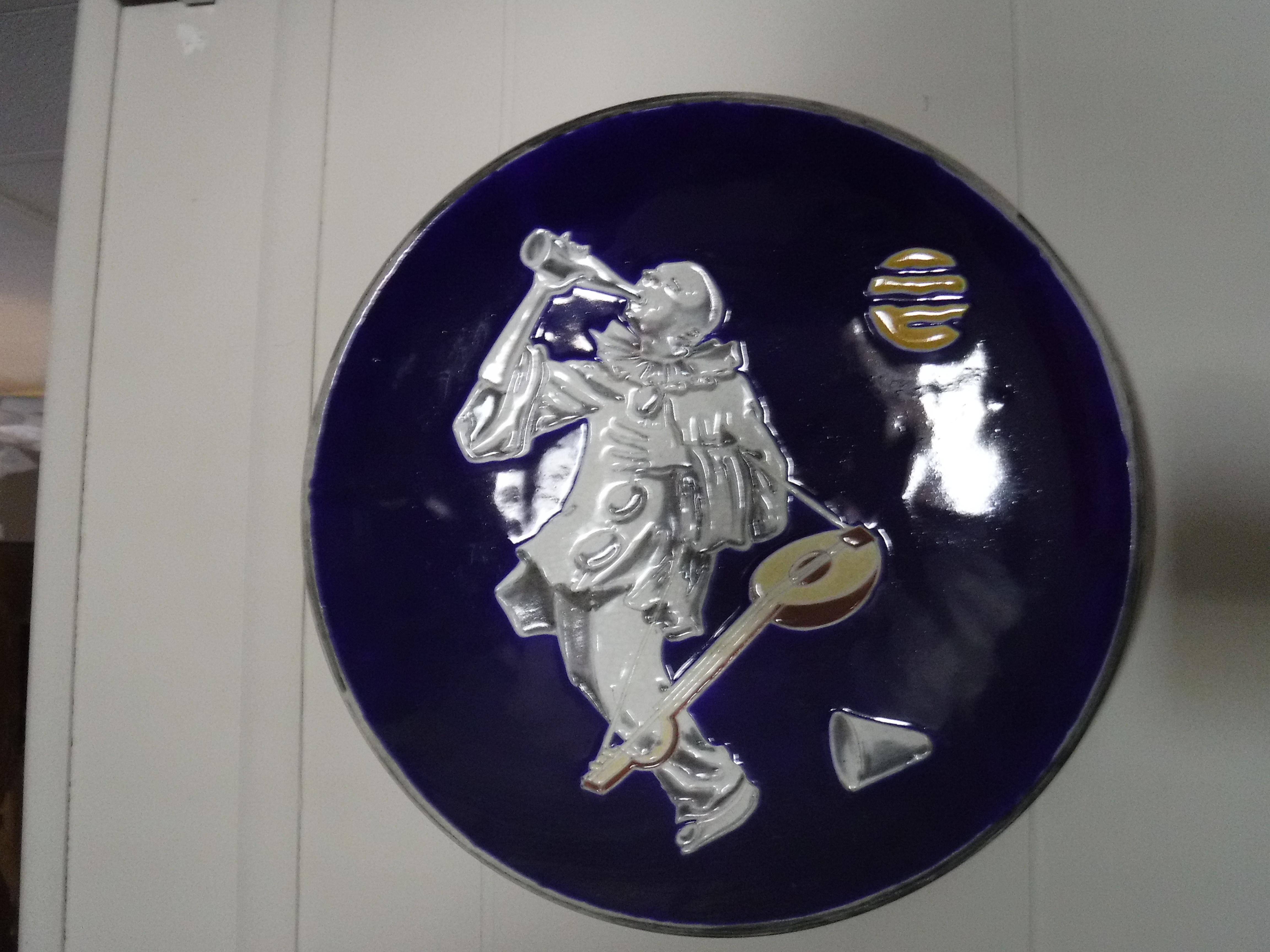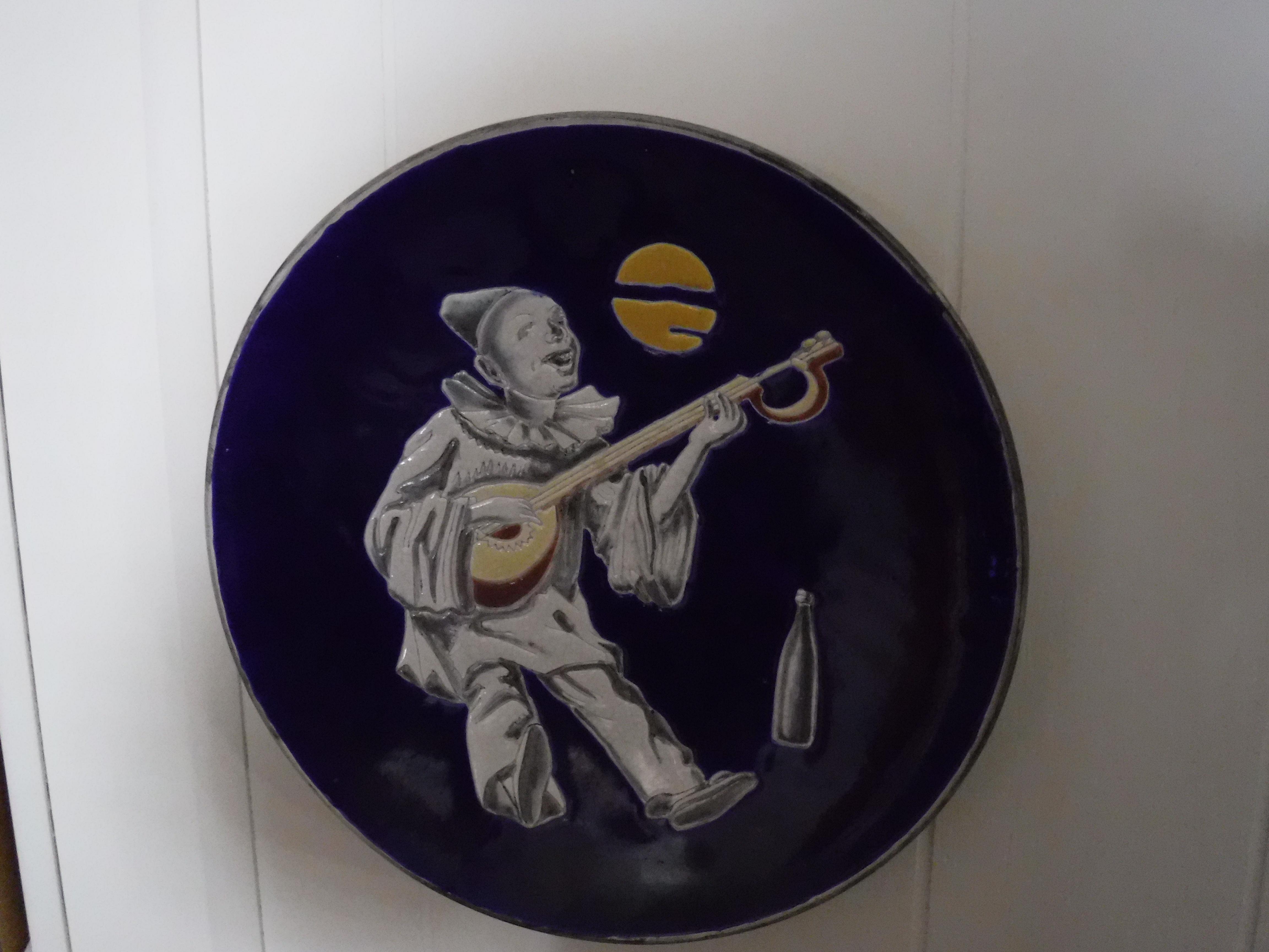 It is a picture plate of a minstril playing a lute (?) and drinking wine (98)