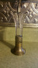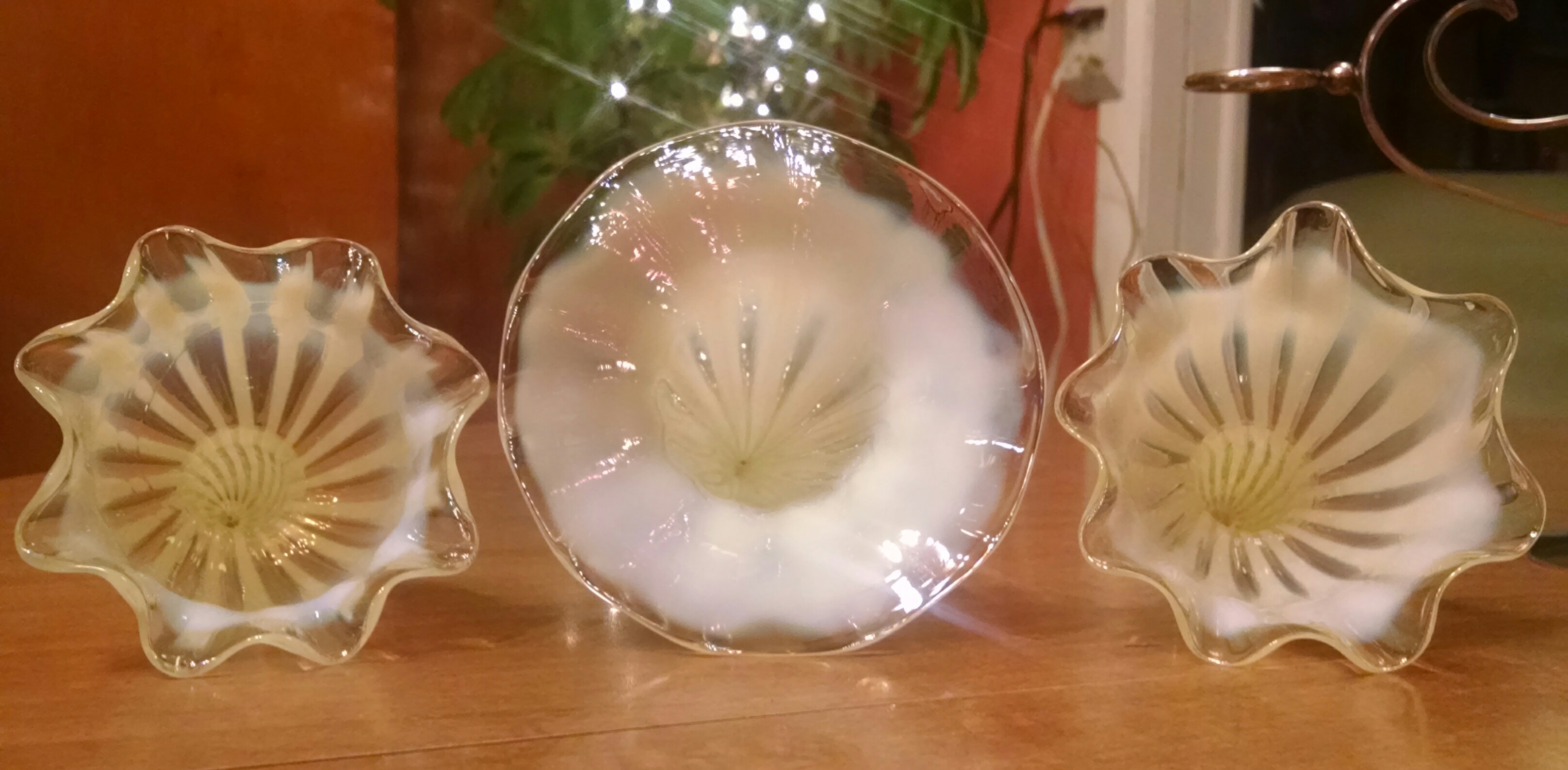 Antique 3 fluted glass vases sit individually in ornate silver base. It was purchased over 45 years ago from an antique store. The center vase measures 9" long and has milky white stripes and clear glass. The two side vases measure 5 1/2" long, also clear glass with the white milky stripes. Note: there is small visual flaw in 1 of the side vases. It looks like the clear runs thru 5 of the milky stripes, you can't feel it and it is NOT a crack! These are chip and crack free and the entire vase is in mint condition! I would like to know the maker of this and what the value of it is, please?