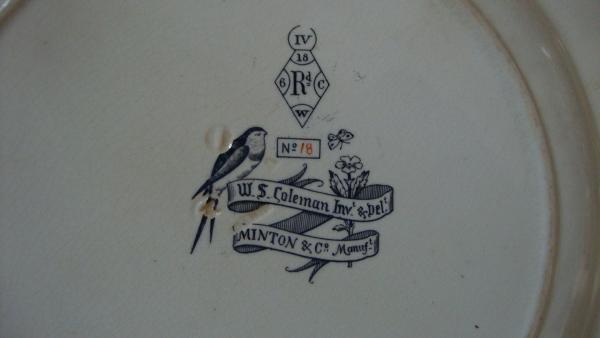 (lifted some text from a previous entry I found on this site, which sounds exactly like my plates). Each plate has about 4-5 images, including fish, shells, butterflies, flowing grasses, elegant looking flowers, each image is seperate on the plates and of reasonable size from 2inch -3inch. On the back of each item, is a diamond shape at the top with in the 4 corners of the diamond shape are letters and numbers, starting from top in a clockwise order they are, 18, C, W, 6. in the middle of the diamond is Rd. Under the diamond each plate has a different number in red.Tthere is what looks like a Swallow,under the diamond, to the left, on the right is a daisy like flower and a small butterfly.Just underneath that, written on a sort of swirly ribbon design,is. WS Coleman Inv s-Pel (or Del?), and a little under that is MINTON & Co Manuf. There are indented marks with letters too.