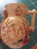 I am trying to get a picture. The Minton Milk Pitcher is 6 1/2 inches tall and 6 inches wide at the base. It is the Minton "Grape Cluster" pattern. The overall pitcher has the purple hue. The year cypher on the base looks like the cypher for 1881. There is a small crack running through it. It's a beautiful piece of porcelain, with a couple of cracks., but no knicks. My great grandmother purchased the pitcher in Scotland, and brought it with her when she came to the States.