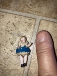 Two tiny porcelain dolls, painted faces and crocheted clothes. My mother who is now 80 was given them by a lady she cared for over 30 yrs ago. The lady was in her 90's then
