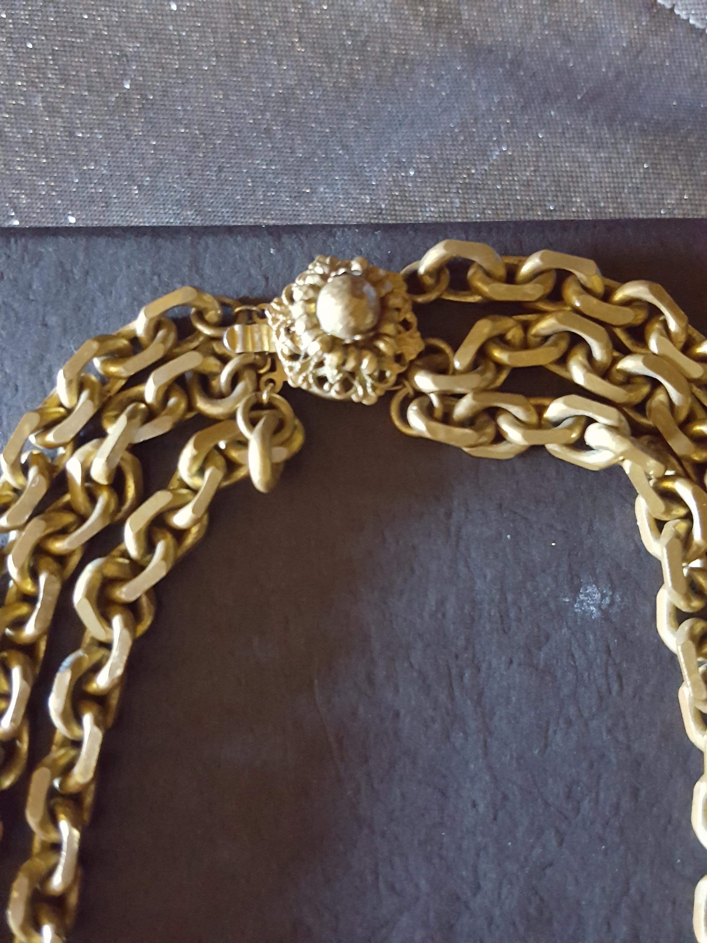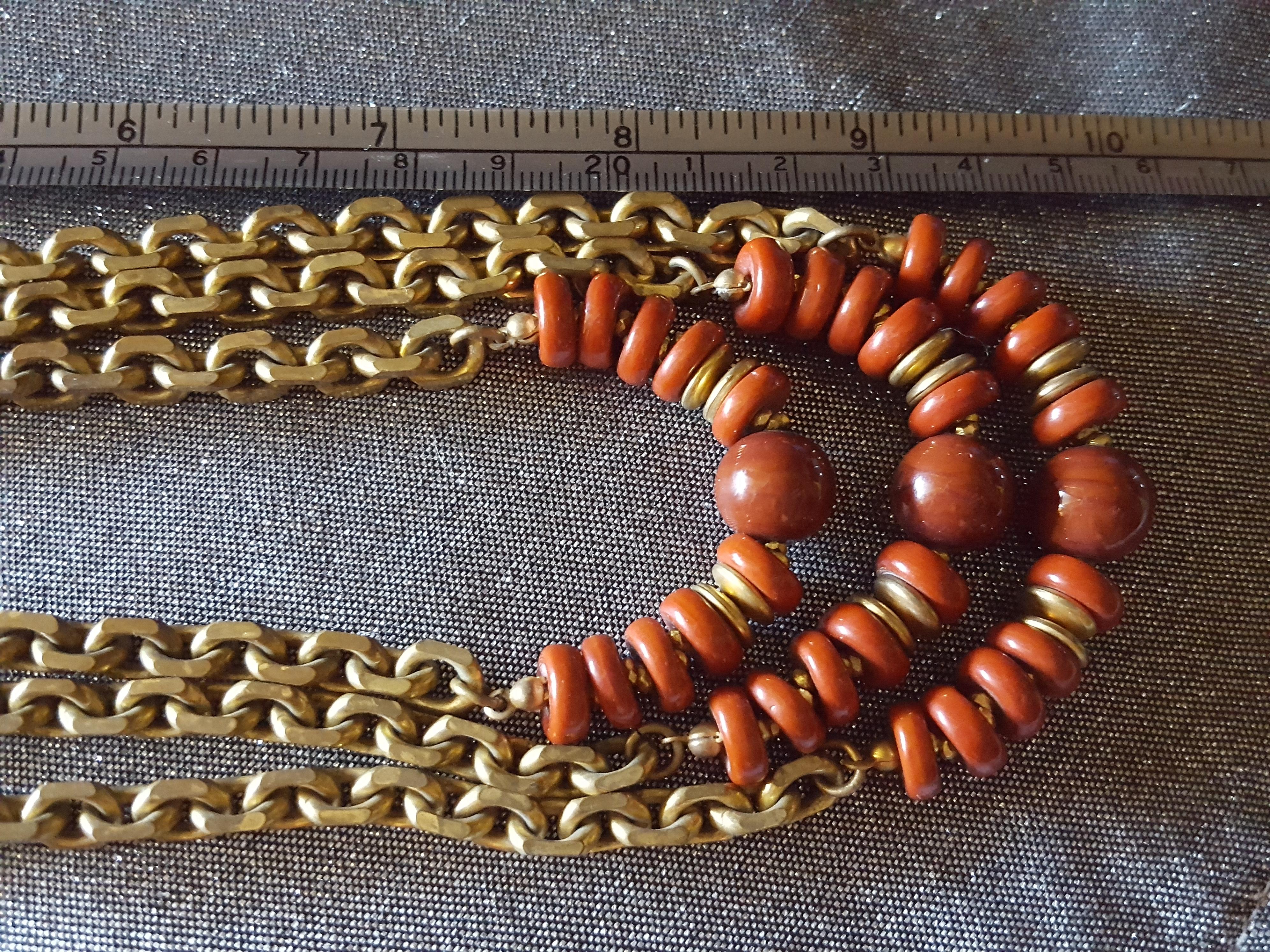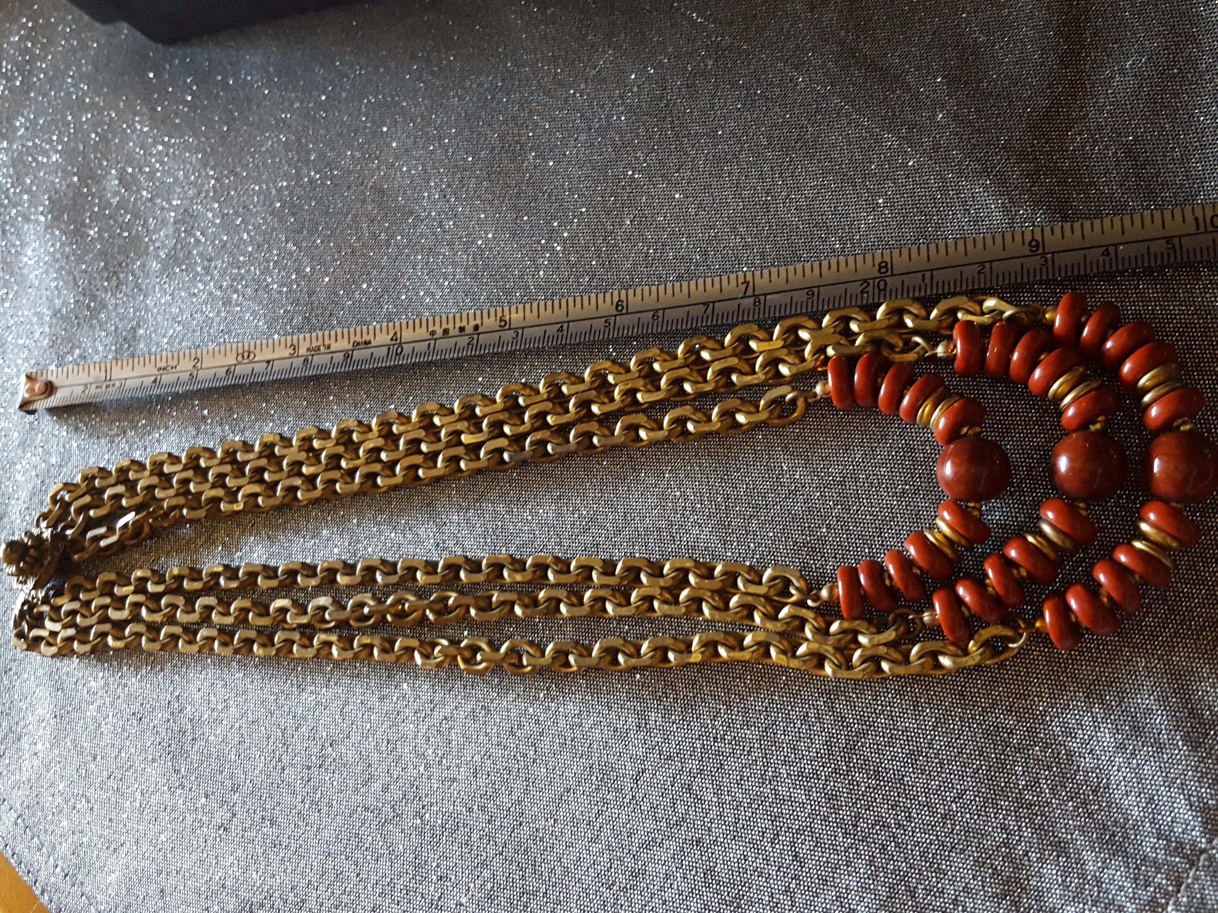 Gold told, three layer chain with deep Orange beads, bakelite? Possible.