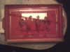 mirrored tray, with pull out drawer lined in red velvet, victorian style feet, perhaps brass