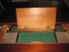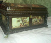 I bought this at a yard sale about 8 years ago. It has brass like around the mirror, the legs are make out of the same brass like, the drawer handle is also, it is lined in red velvet.