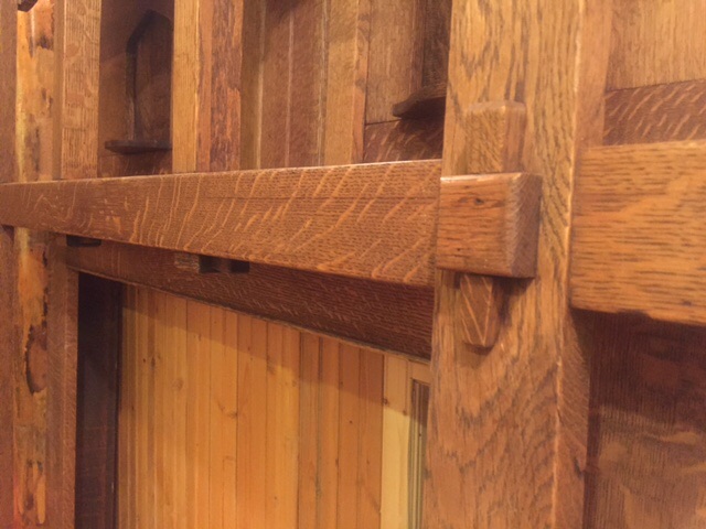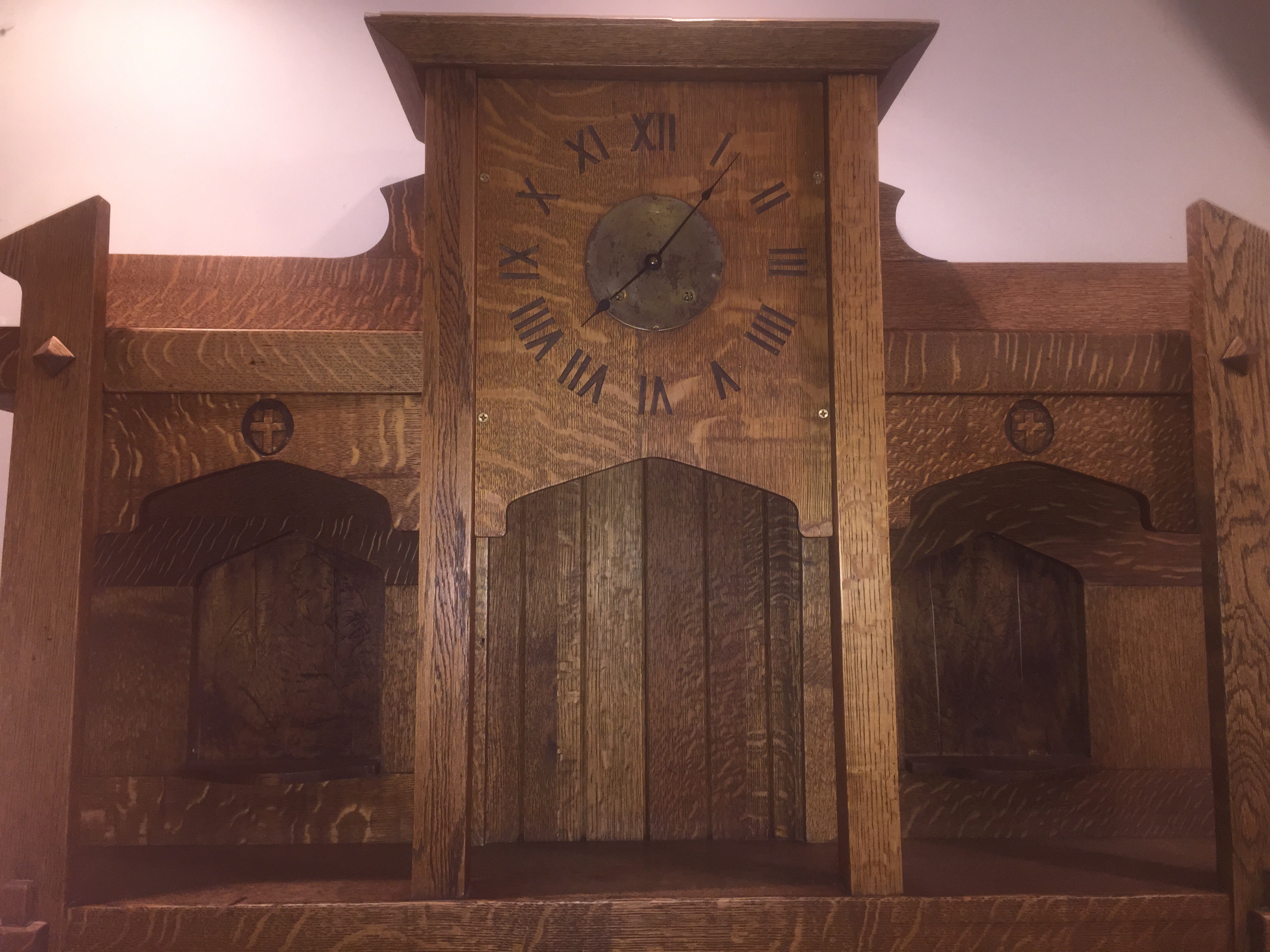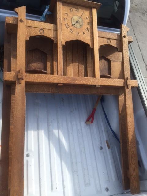 The wood on this piece is in perfect condition with damage. The clock appears to be complete. I just got this and it doesn't fit where I want it to go so regrettably I have to sell it. I'm not sure if the clock works since I've literally had this less than 24 hrs. It's amazing! It's mission style from 1880 to 1910. It's measures 80" tall at the top of the clock, 58" wide and the opening for the fire place is 41.5" by 41.5". It's 10.5" deep. It's solid oak but not unmanageable. My husband and I brought it in our house ourselves. The truly unique thing about this piece is that I believe it came out of a monastery, most likely catholic. There are two small crosses as seen in the photos and two characters carved into the oak. Both are of a priest possibly sitting and drinks by from a stein and smoking a cigar. The numerals on the clock ck face are also hand carved. I'm not a religious person nor did I intend to use this as a mantel. I was going to put a book shelf in the fireplace cutout. It has a lot of shelf space for picture, knock knacks or candles. Let me know if your interested!