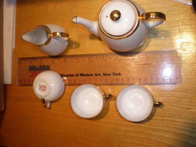 Mitake Child's Tea set. 5 cups and saucers, creamer, covered sugar bowl, Eliptical serving dish with cover and underplate. Gold trim. Hand painted. I assume the original set had 1 more cup. No chips. Don't know the date, probably 1930 - 1950.