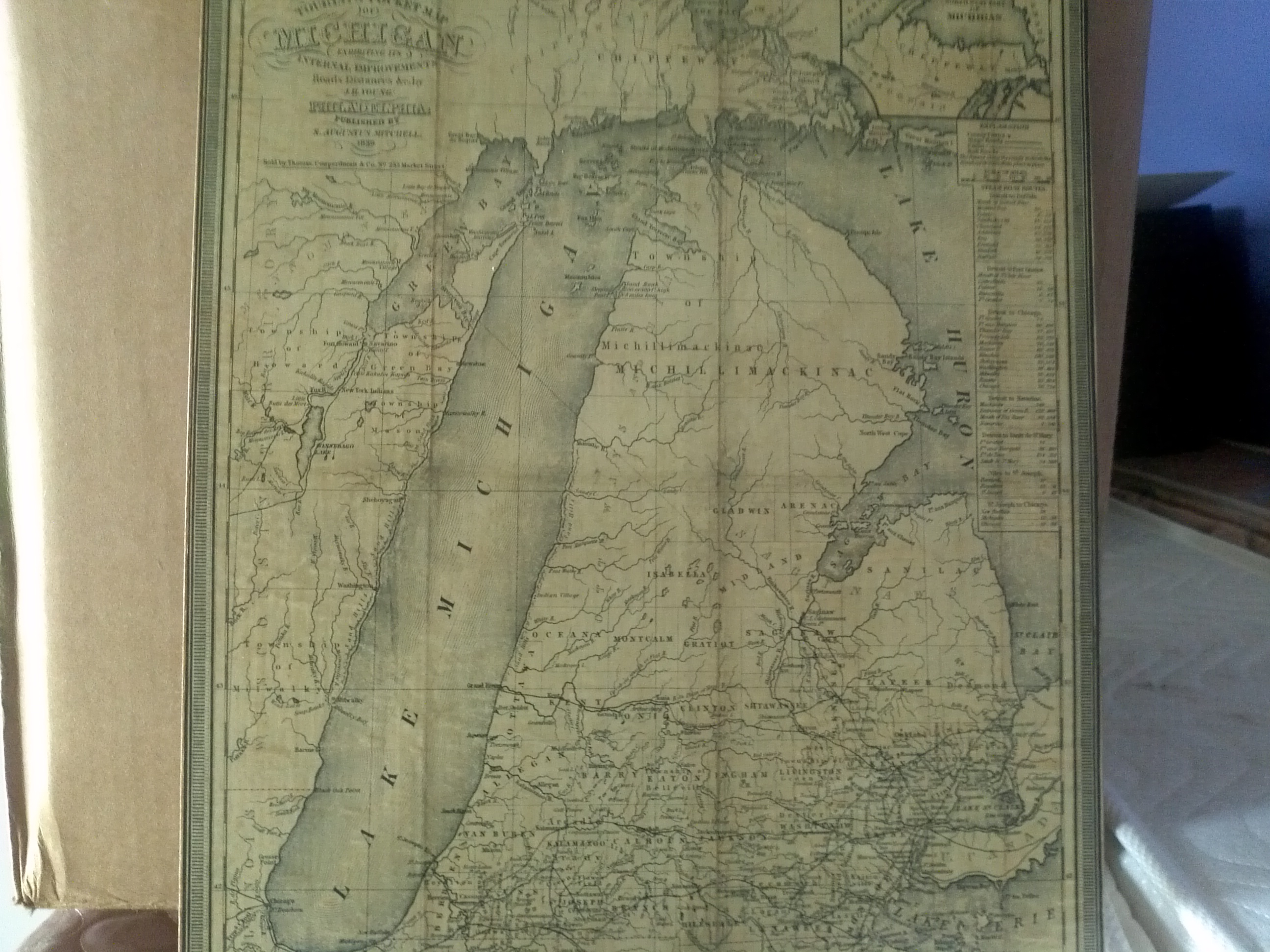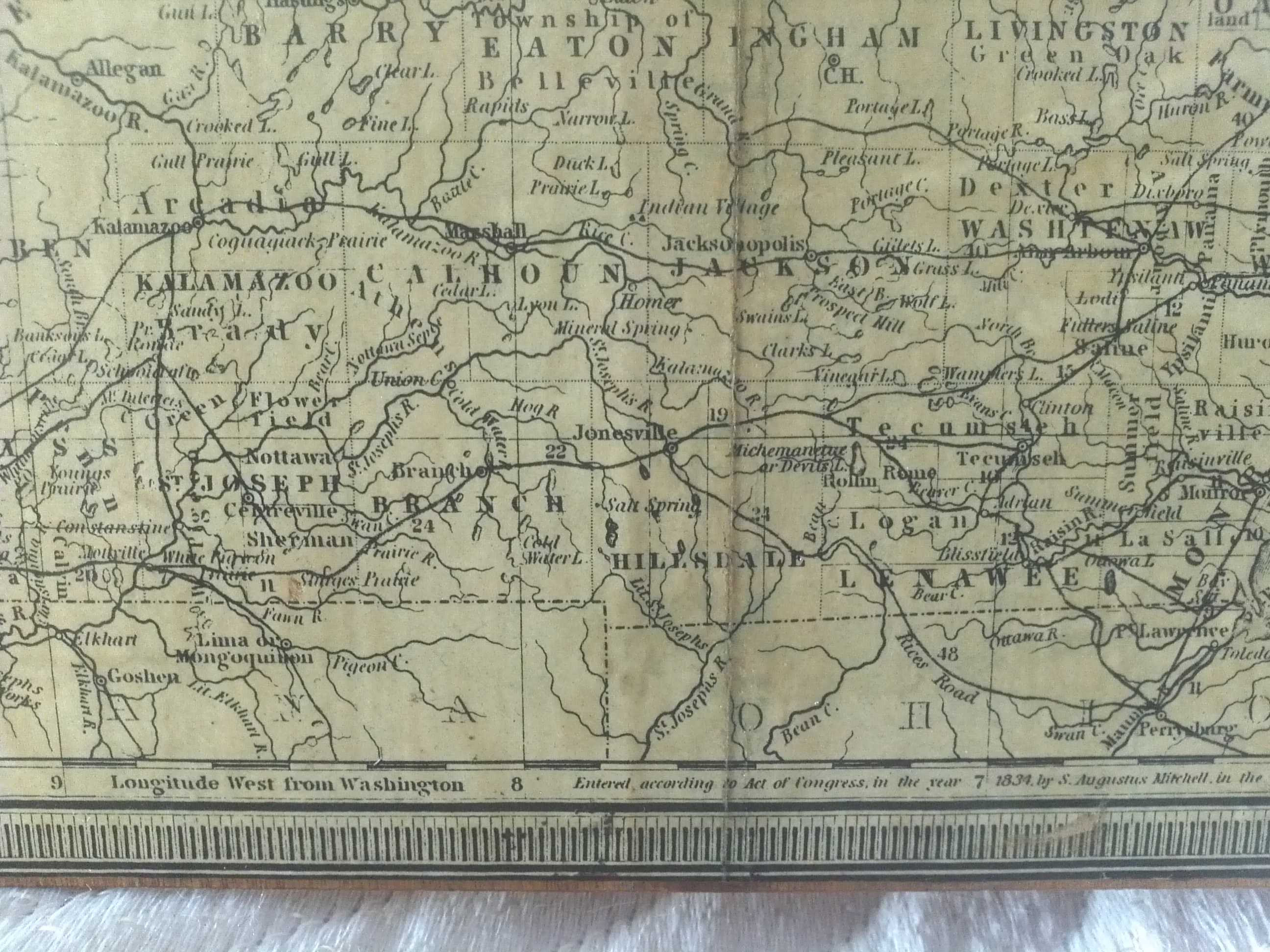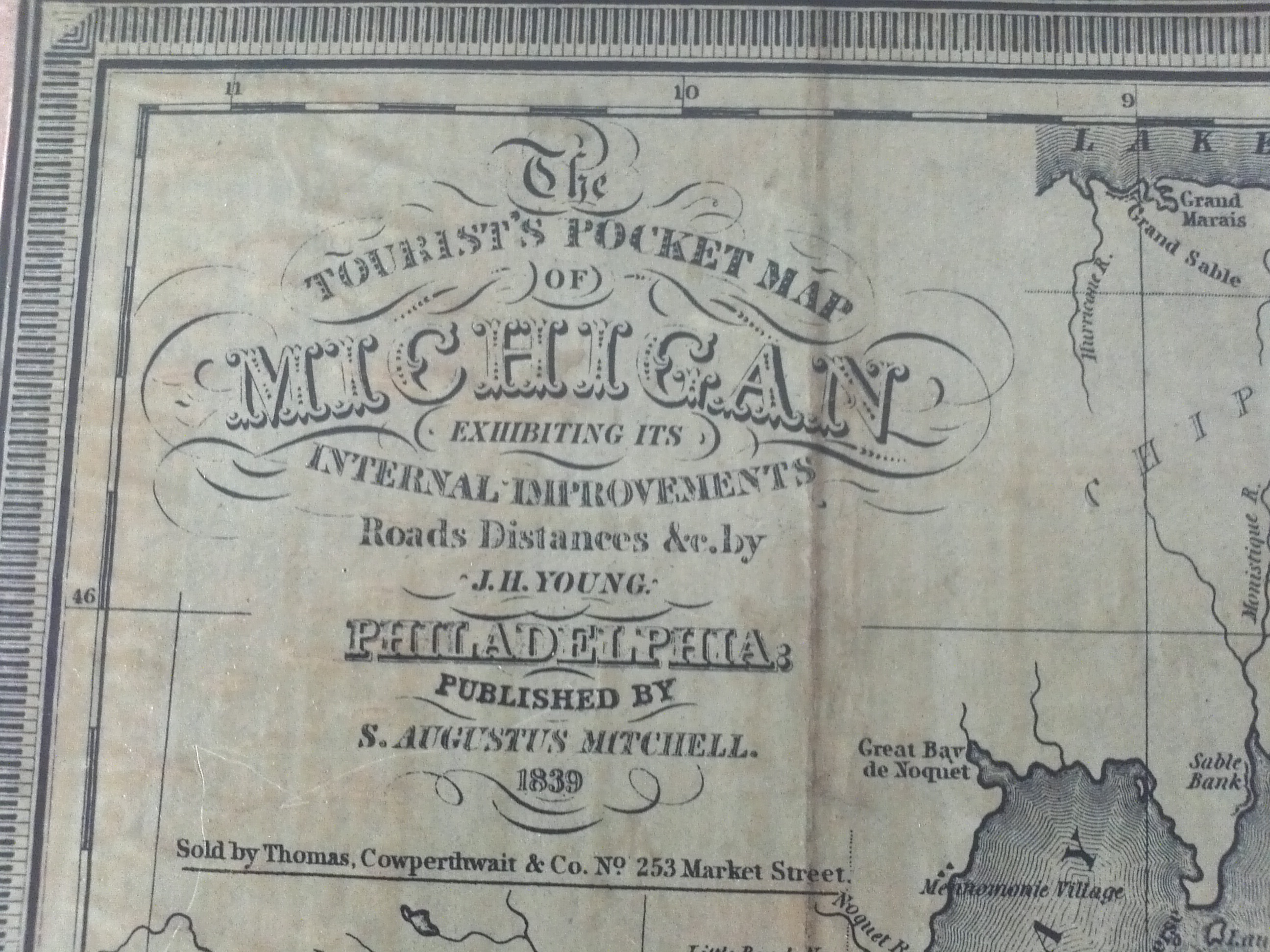 Dated 1839. Tourist pocket map of Michigan published by S. Augustus Mitchell. Sold by Thomas, Cowperthwait & Co. No 253 Market street. On the bottom of the map it says Entered according to Act of Congress in the year 1834 by S. Augustus Mitchell in the clerks office of the district court of the eastern district of Pennsylvania.