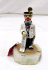 Little Boy playing dress up and pretending to be a doctor, glasses atop his head, white robe covering his clothes. Knife and scissors in right pocket. slippers on his feet with a doll laying at his feet. On the base to the right there is a signature of M.J. Hummel