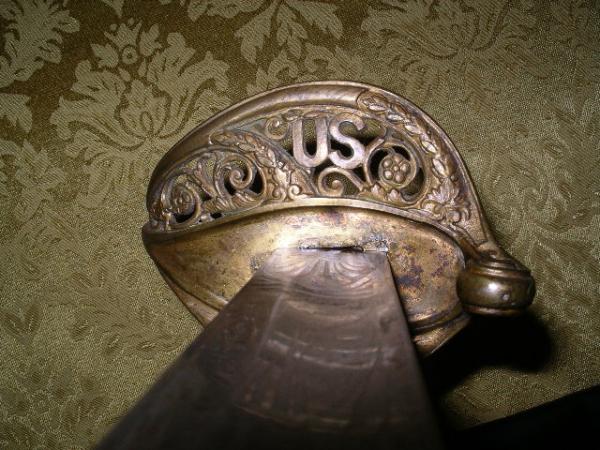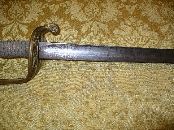 Another mark, an oval with three stars over an "E" and either an "L" or a "1" is stamped into the hilt.  Engraved on the upper edge of the blade is "06" followed by what may be "Klingenthal" (a Civil War sword manufacturer, followed by what appaers to be "Cal ..." or "Bal..."