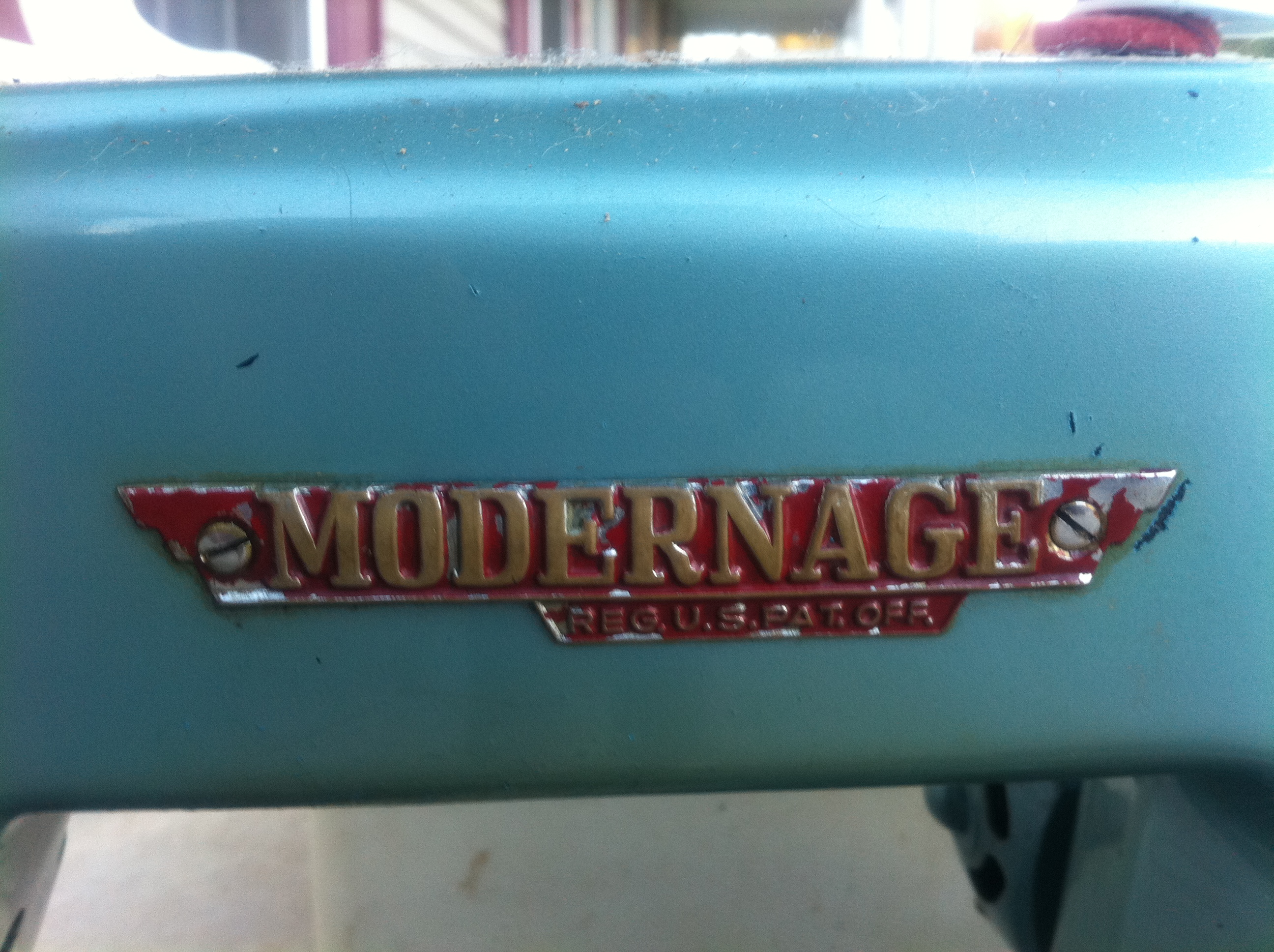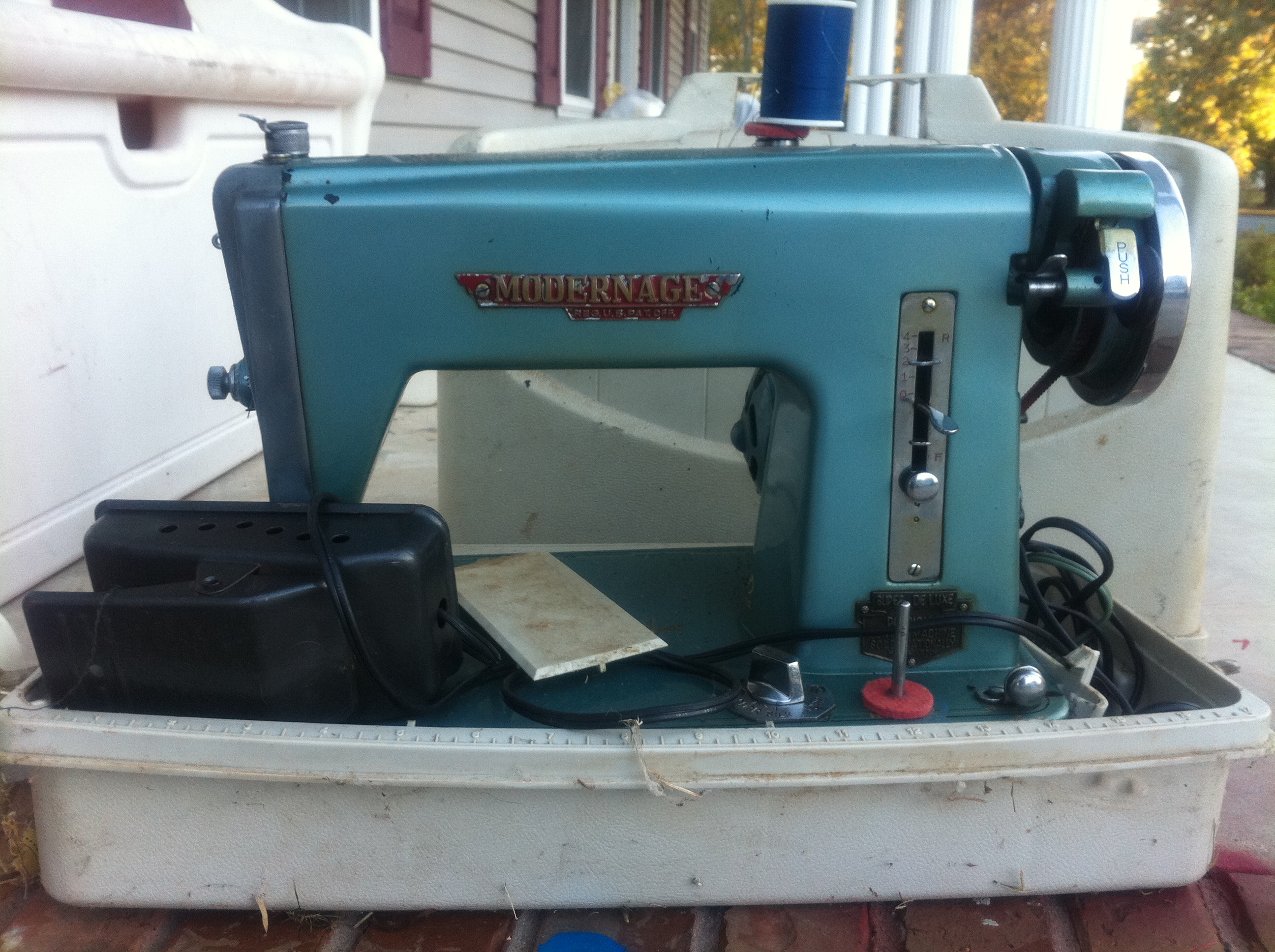 Modernage Super De Luxe sewing machine from approximately the 1950's. Little is known about this sewing machine. I had forgotten we even had this out in the garage. My mom got it from someone. We don't even know if it works right now. I was just curious about it's value because it's obviously an antique.
