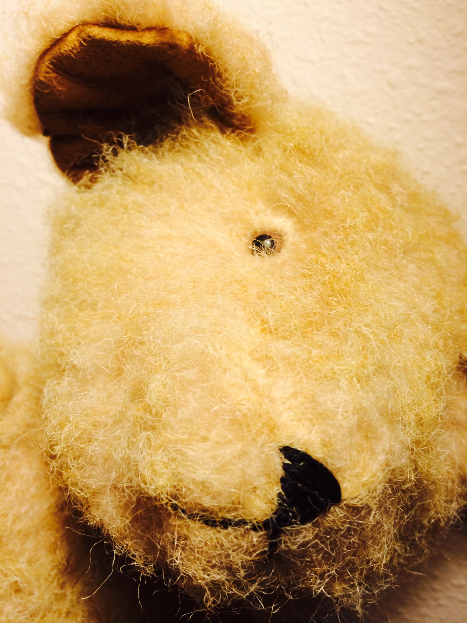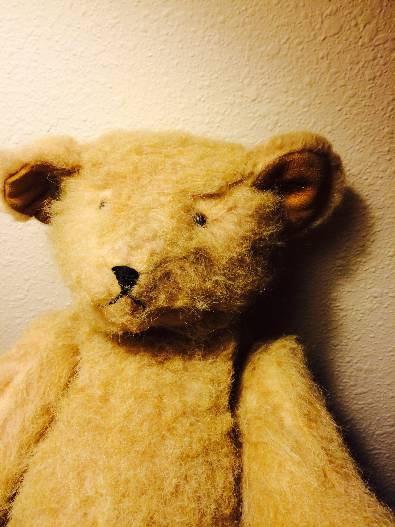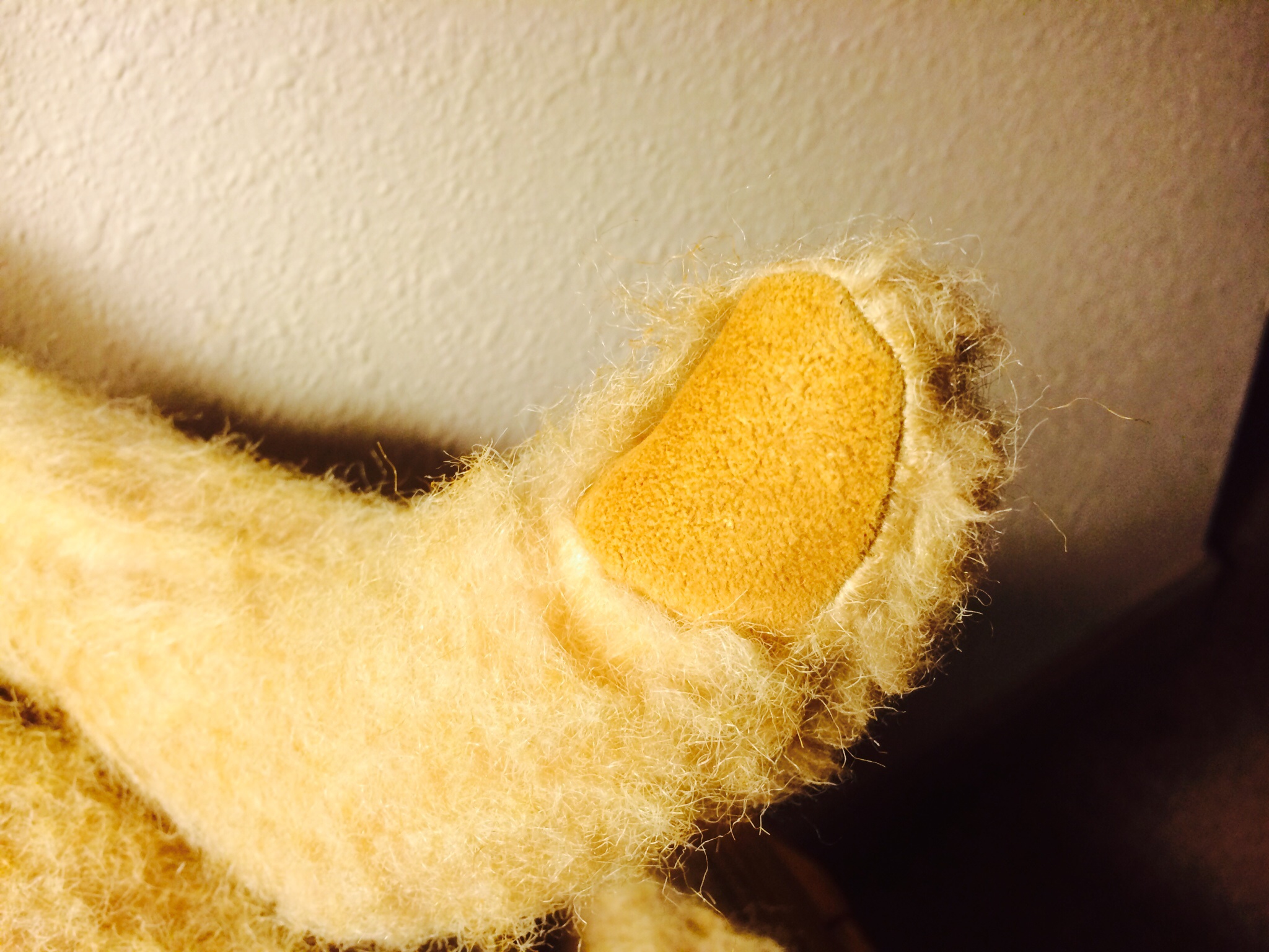 I know nothing about this bear! Light brown mohawk with felt (?) all 4 paws & inner ears. Ears are horizontal to eyes not on top of head. Black stitched mouth & nose. Small brown eyes with black pupils.no identifying tags does not appear antique old. thank you