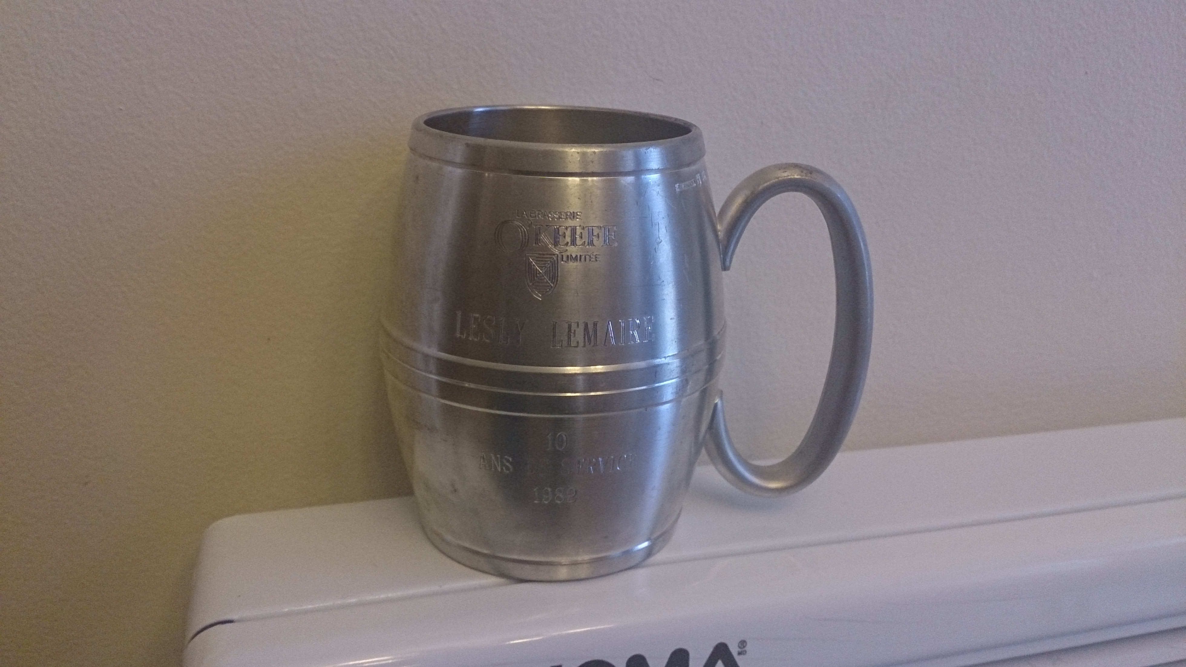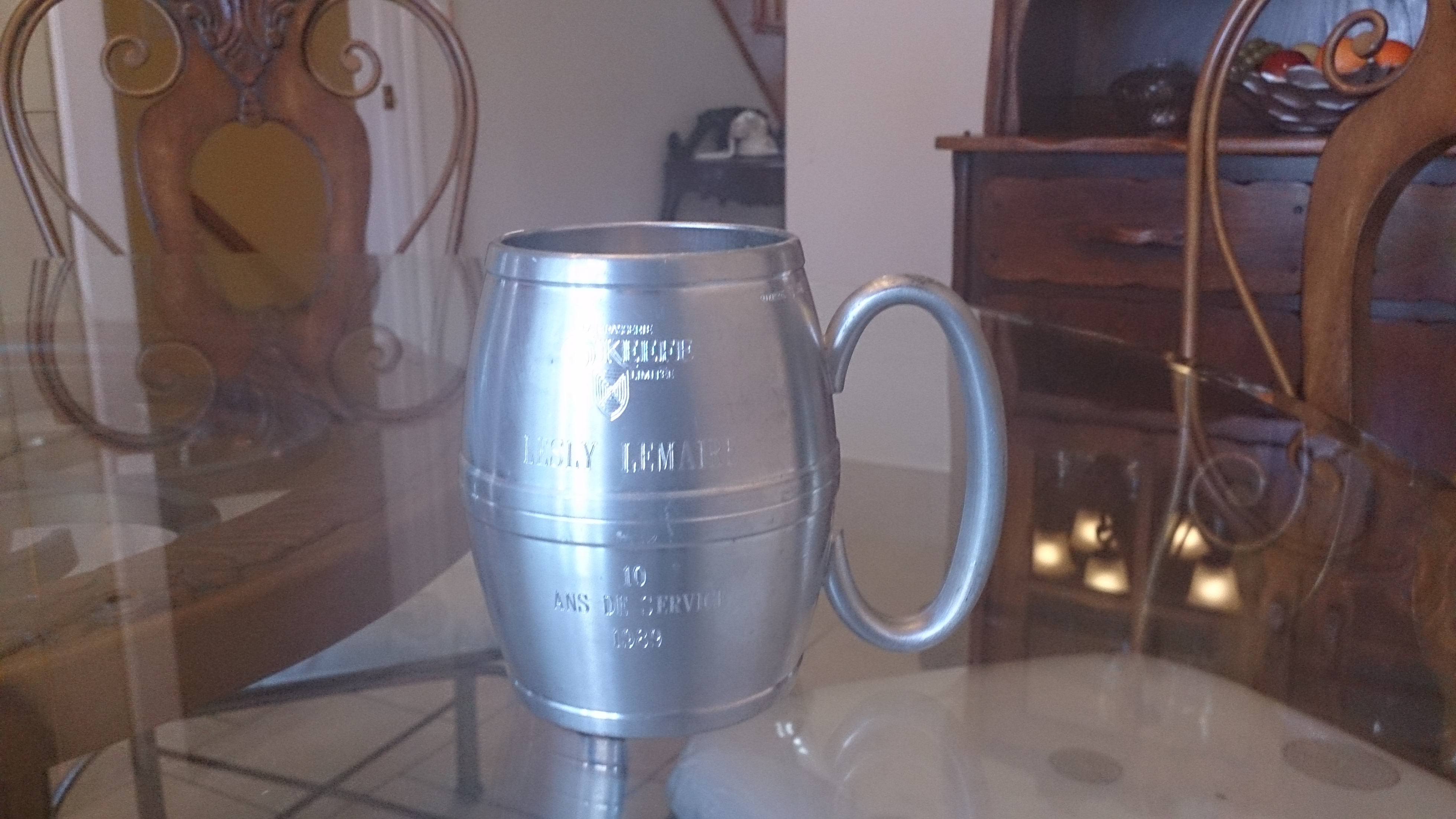 Engraved pewter mug from Molson O'Keef beer company. Mug never been used. Engraving feature employee name dated 1989 for 20 plus years of service.