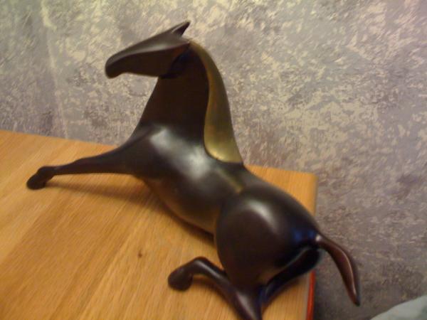 Antiques and Collectibles" by Deborah Rashkin, you'll see on the cover a bronze statue of a pair of running horses. They look very much like the horse you have, even down to the brass highlights. It is 8" tall and 13" wide. Unfortunately, this piece is also unmarked, but in 2001 when the book was published, this piece was valued at $400.00. I hope this helps!
