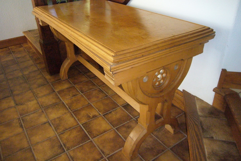 We bought this table from the people who sold us our house. Unfortunately I did not ask for any details about the table, all we were told was that it is a table from a monastery. It has faint design around the edge of the table top,  and a faint cross in the center of the table. I am not sure what style of cross this is. I am interested in getting more information about it, and find out if it is even worth what  we paid for it.