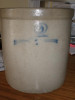 Monmouth covered, handled crock that is signed Kinaiman. Bottom has maples leaf with Monmouth, ILL USA. Measures 7" high with lid and 8" wide from handle to handle.