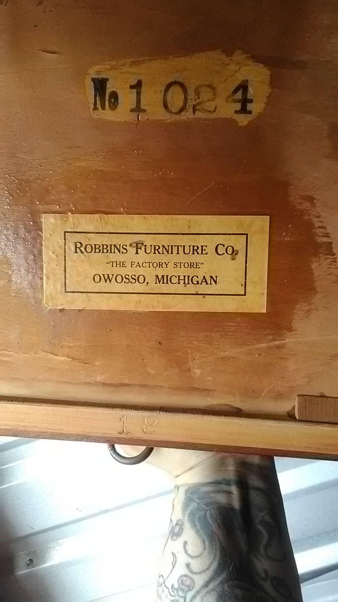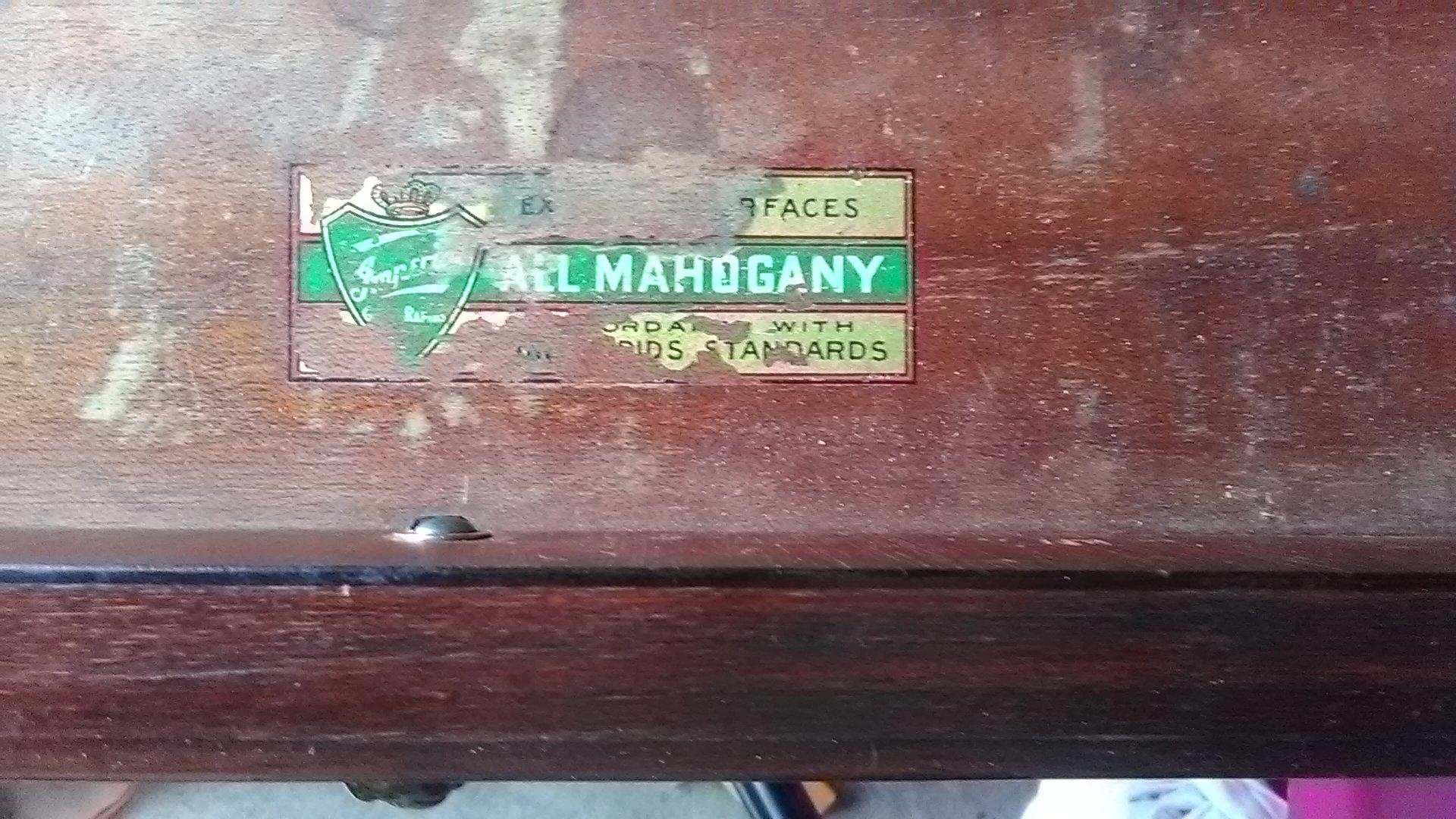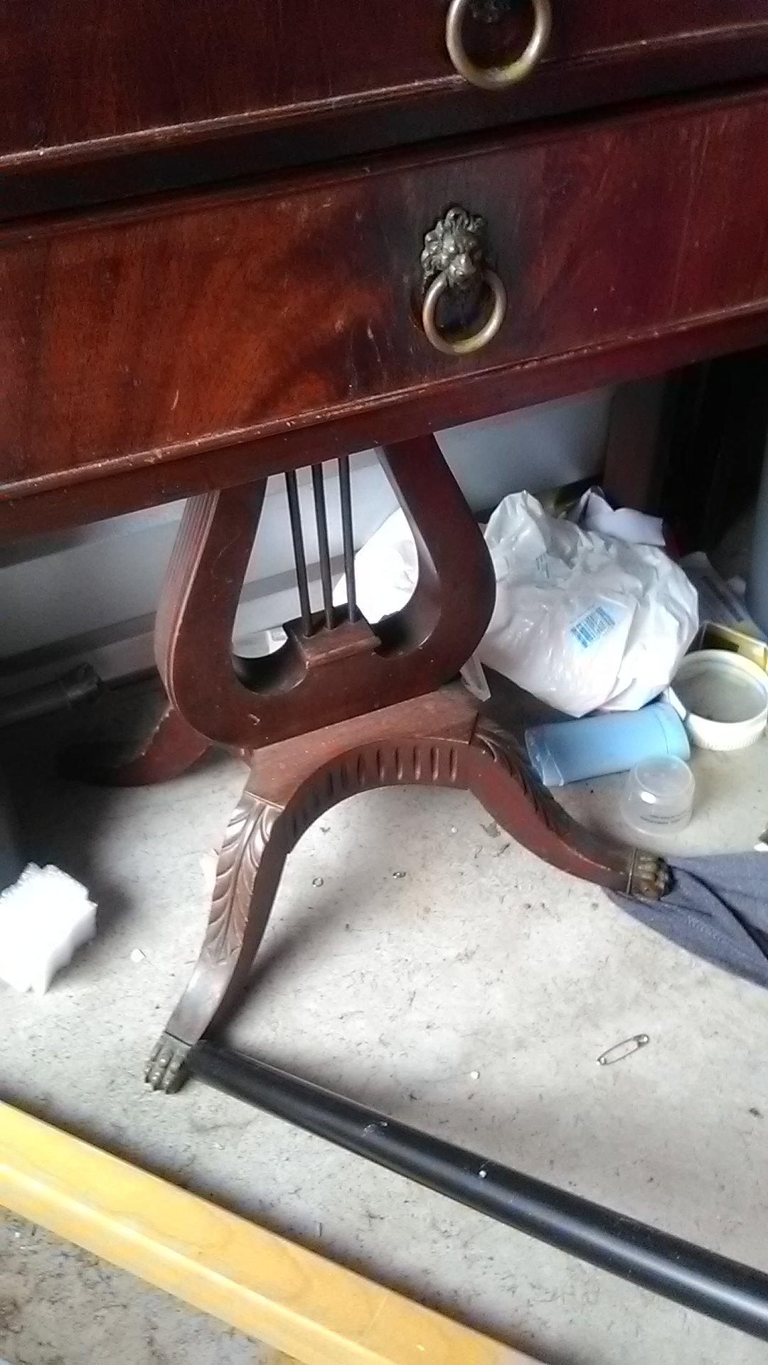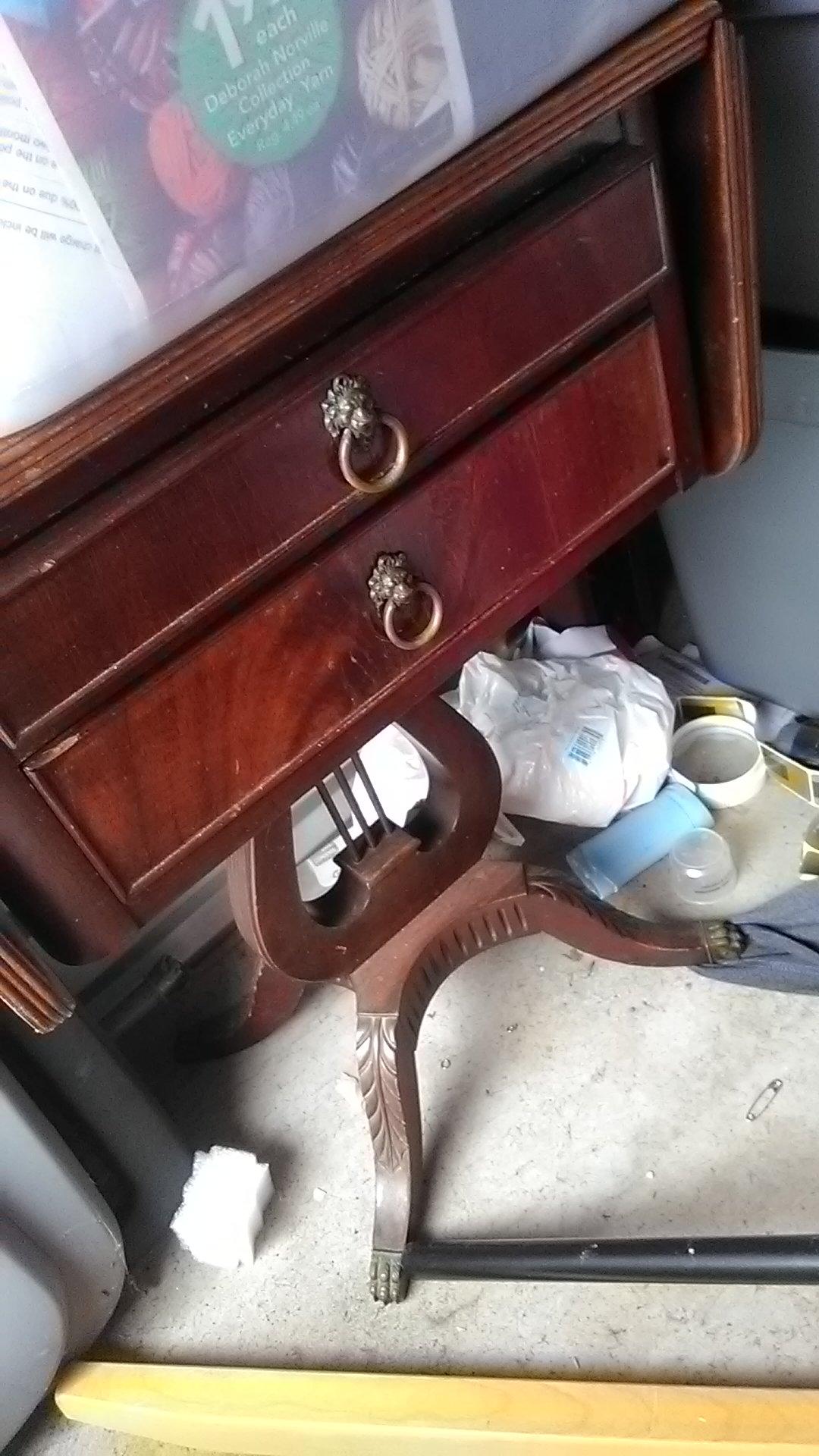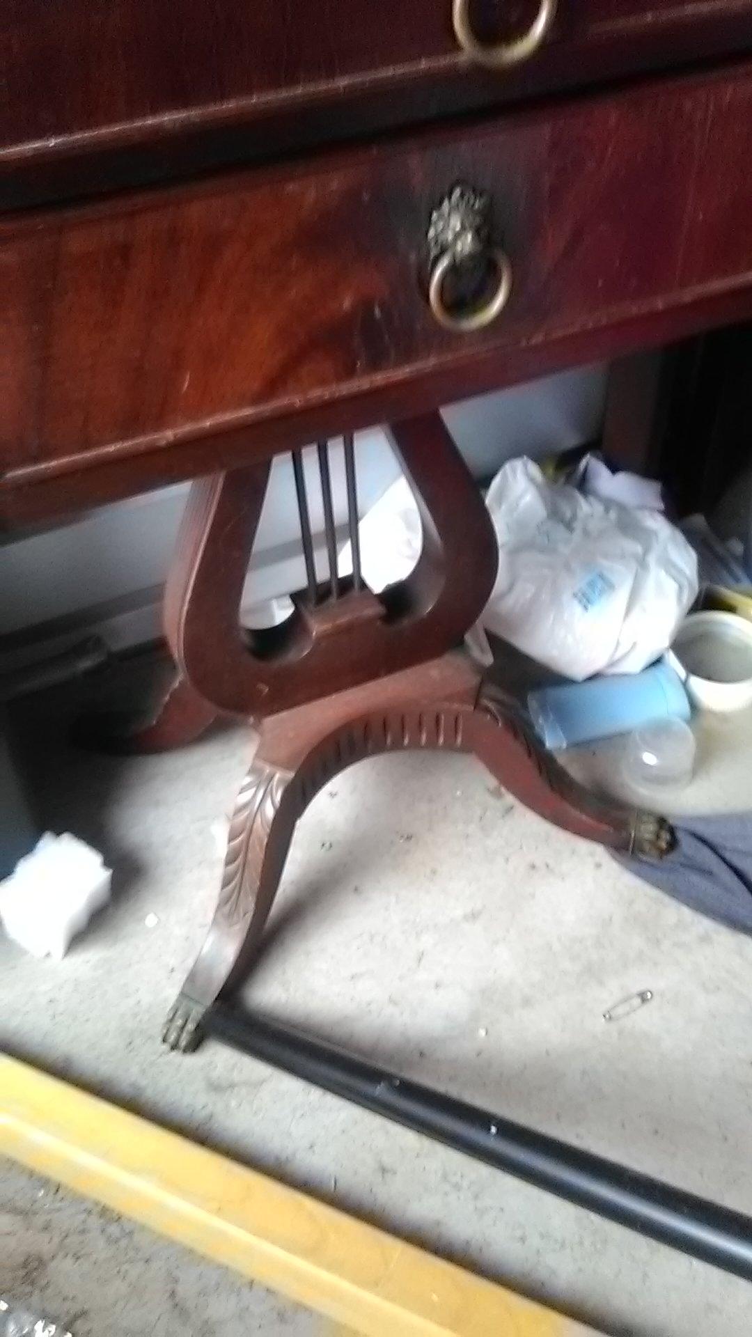 Monogany drop leaf table has 2 drows that have a lion handles the leg is harp shape the feet are I believe brass claws it's made by Robbins furniture co #1029