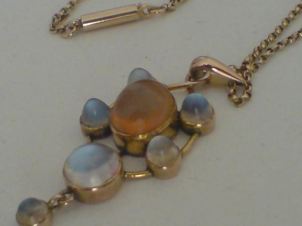 Gold and moonstone pendant. Orange centre stone and bluey grey stones around.