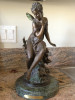 This statue has a black marble base, and is a statue of a woman walking two dogs. The statue is signed A. Moreau. The statue is made of bronze.