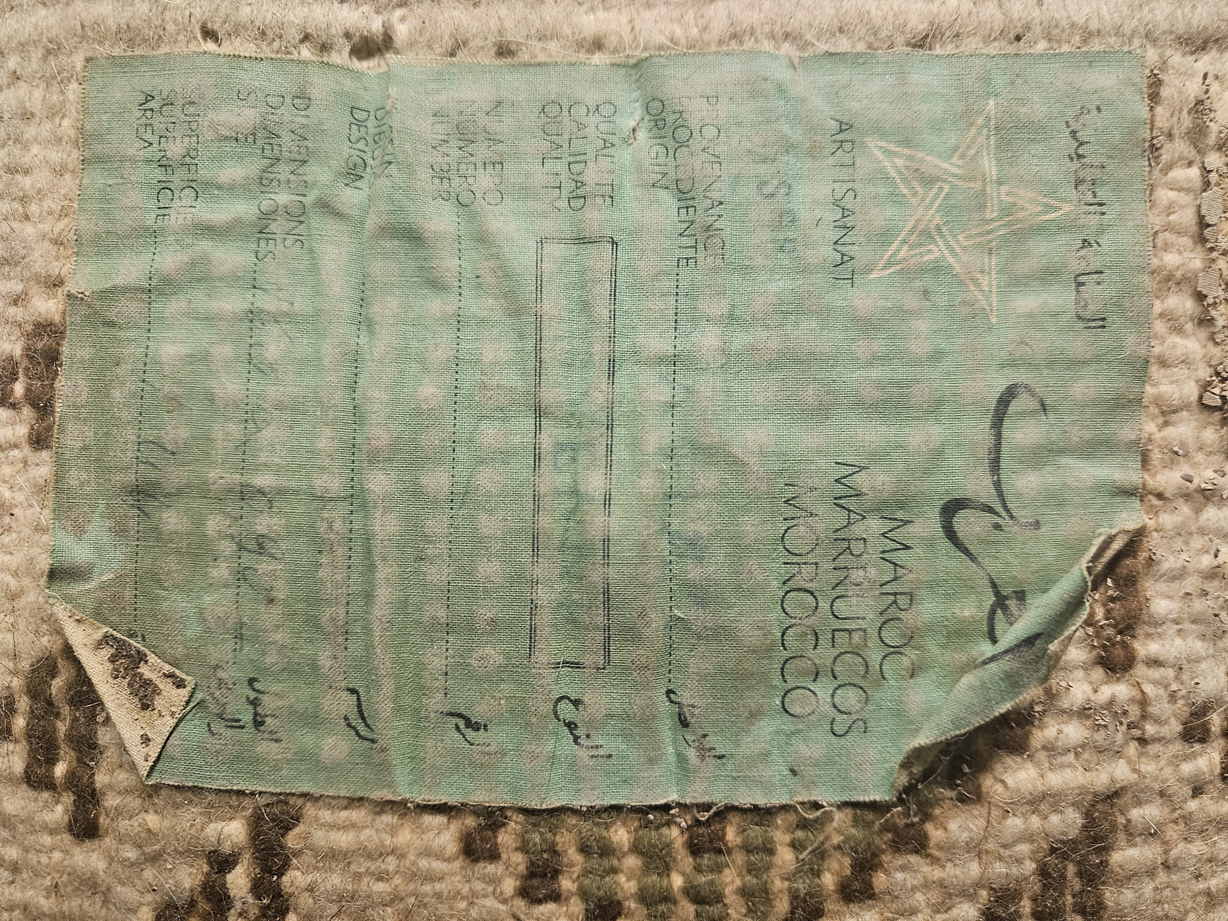 Moroccan rugs with this type of label were often government-inspected exports, especially from the 1970s through 1990s, when Moroccan wool rugs surged in popularity globally. Rugs of this size and pattern were typically woven by women in village cooperatives, particularly in the Middle Atlas region. The tight, geometric motifs are characteristic of Azilal or Boujaad tribal styles