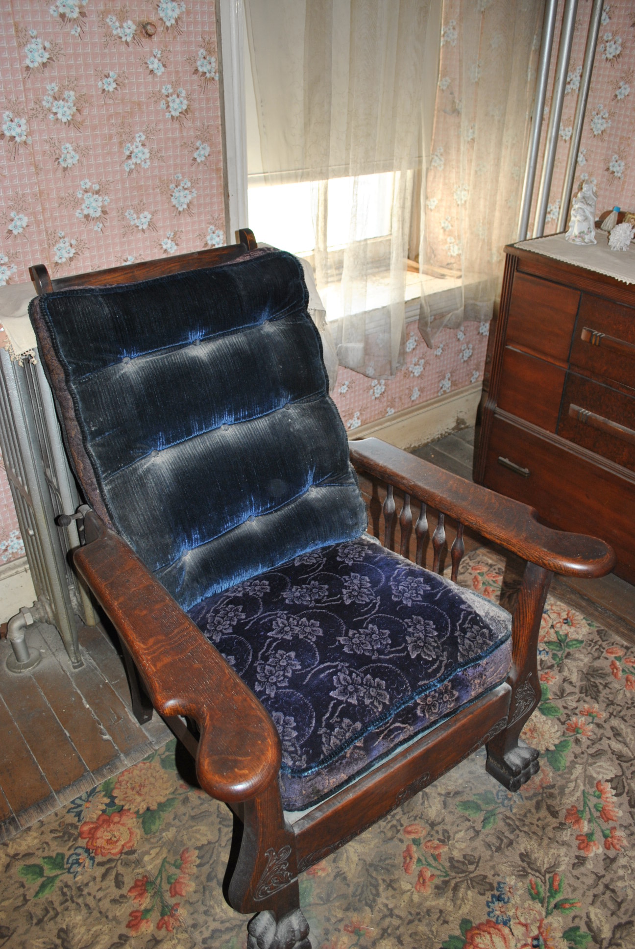 This is a very heavy and sturdy Morris Chair in outstanding condition. It has heavy clawed feet and nice decorated work on the front panel. Original cushions are also in wonderful (but dusty) shape. No one sat in this chair since 1954 when my mom left home as it was in a closed bedroom.