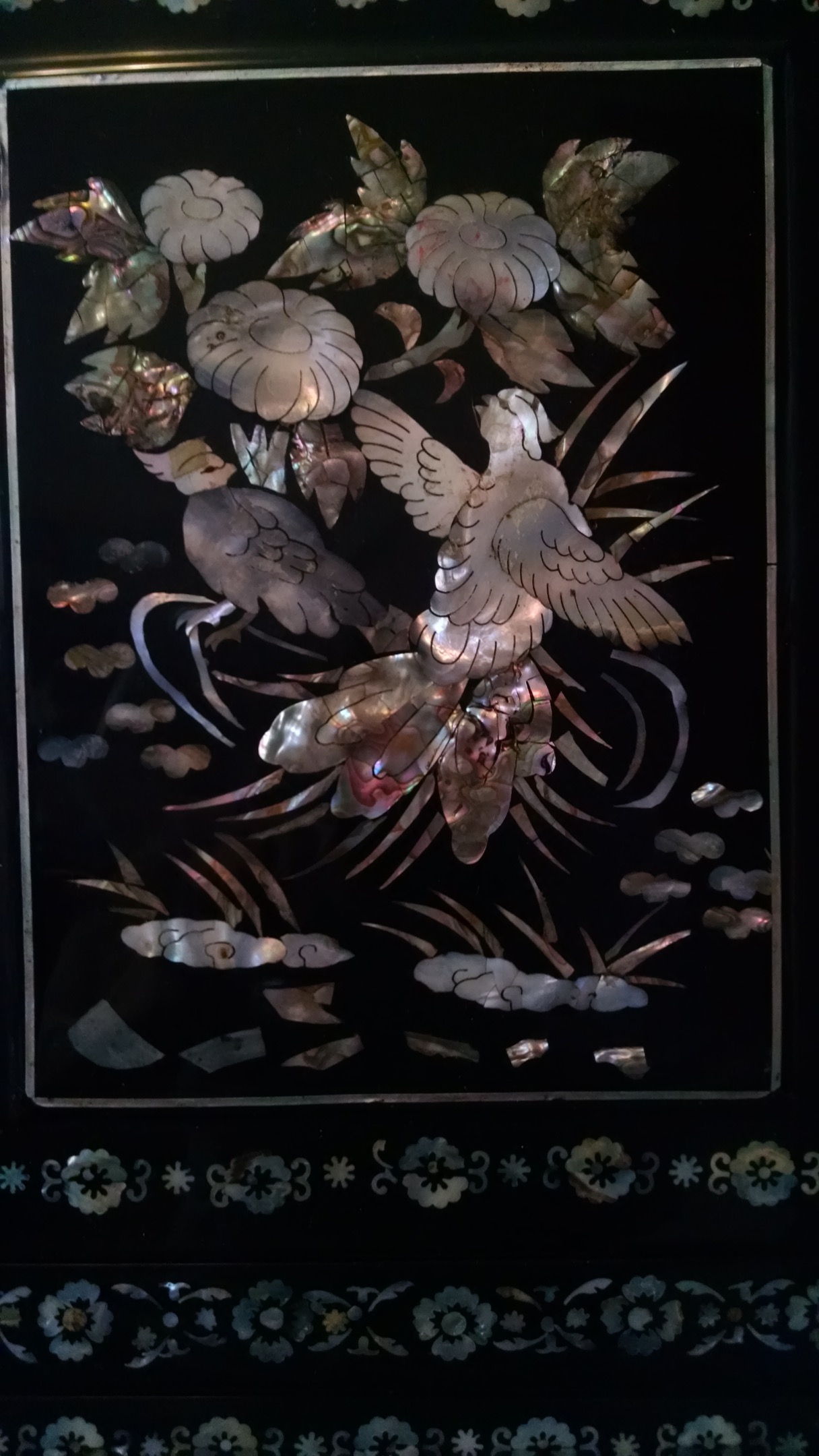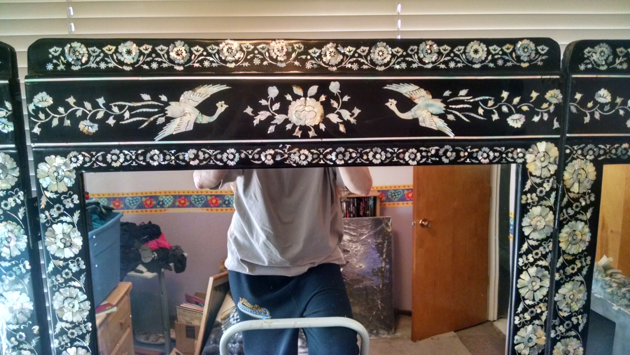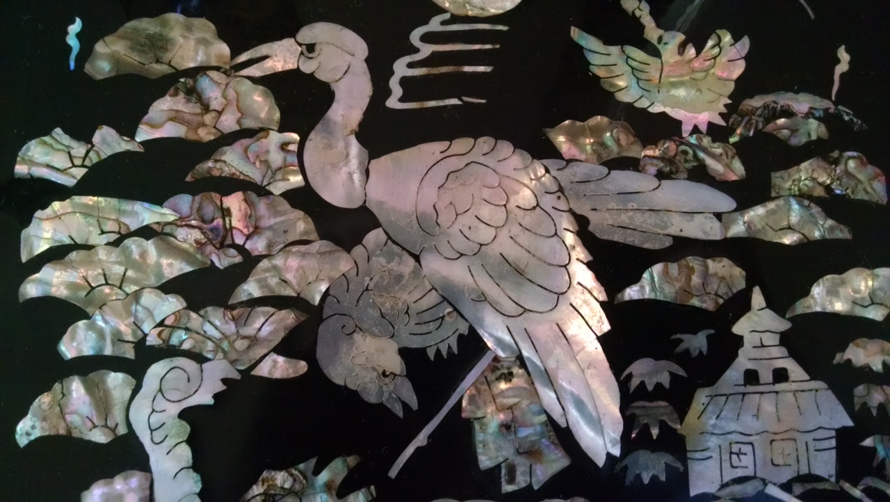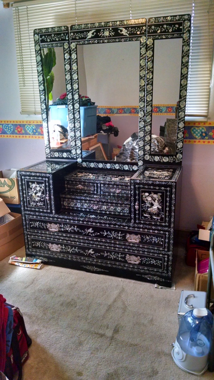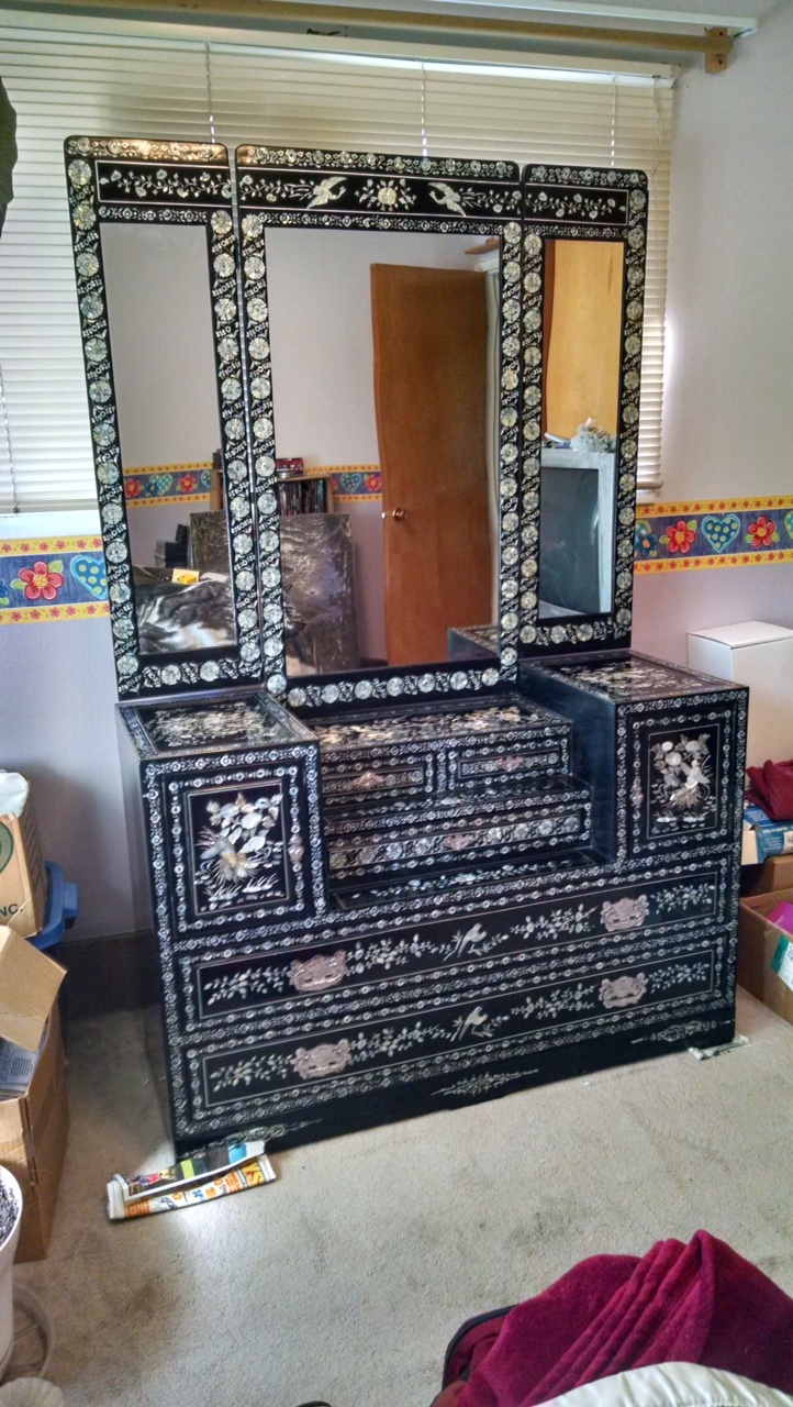 Over 20 years ago my brother did some renovations for some people he knew and instead of paying him in cash, they gave him this dresser. He brought it up here to Alaska to give it to my Mother for her birthday and she absolutly loved it and took good care of it. Well my Mother has since passed several years ago and the dresser was willed to me. Now I do have many of my Mothers personal items to remember her by so I would really like to see this dresser go to someone who would get the enjoyment out of it that she did. Unfortunately I don't know alot about this piece except that it is a Korean dresser and all the mother of pearl shells were shaped by hand and the pictures designed using them were also done by hand. Then the whole outer part of it has a black laquer finish. Any other information including what this might be worth would be greatly appreciated.