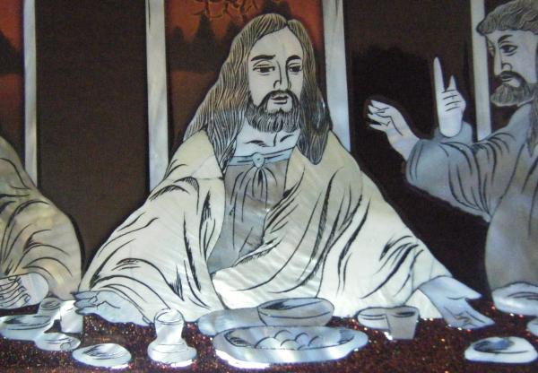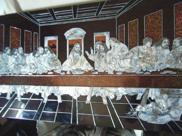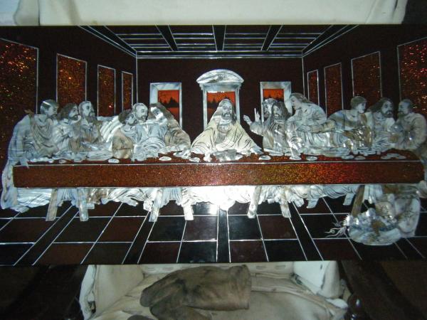 The Last Supper, the 12 deciples are all made out of mother of pearl and when looked at in the righ light Jesus's cloak is comes out yellow! The Fruit bowls and the window panes are also mother of pearl. The floor is brick red and black. The walls and the table are red glitter. When put in the right light this is a beautiful piece of art