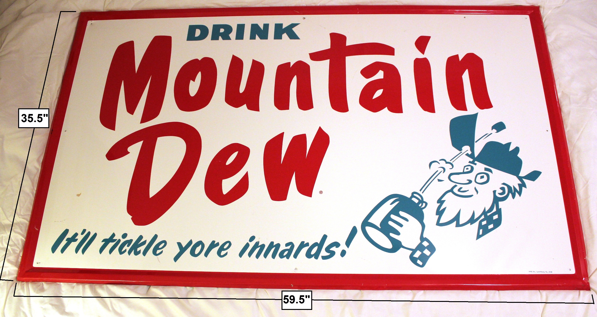 This is an original 1964 Mountain Dew aluminum advertising sign. Judging by the text on the lower right corner I would say it was made in Lynchburg, VA by A-M Inc. Measures 35.5" x 59.5"