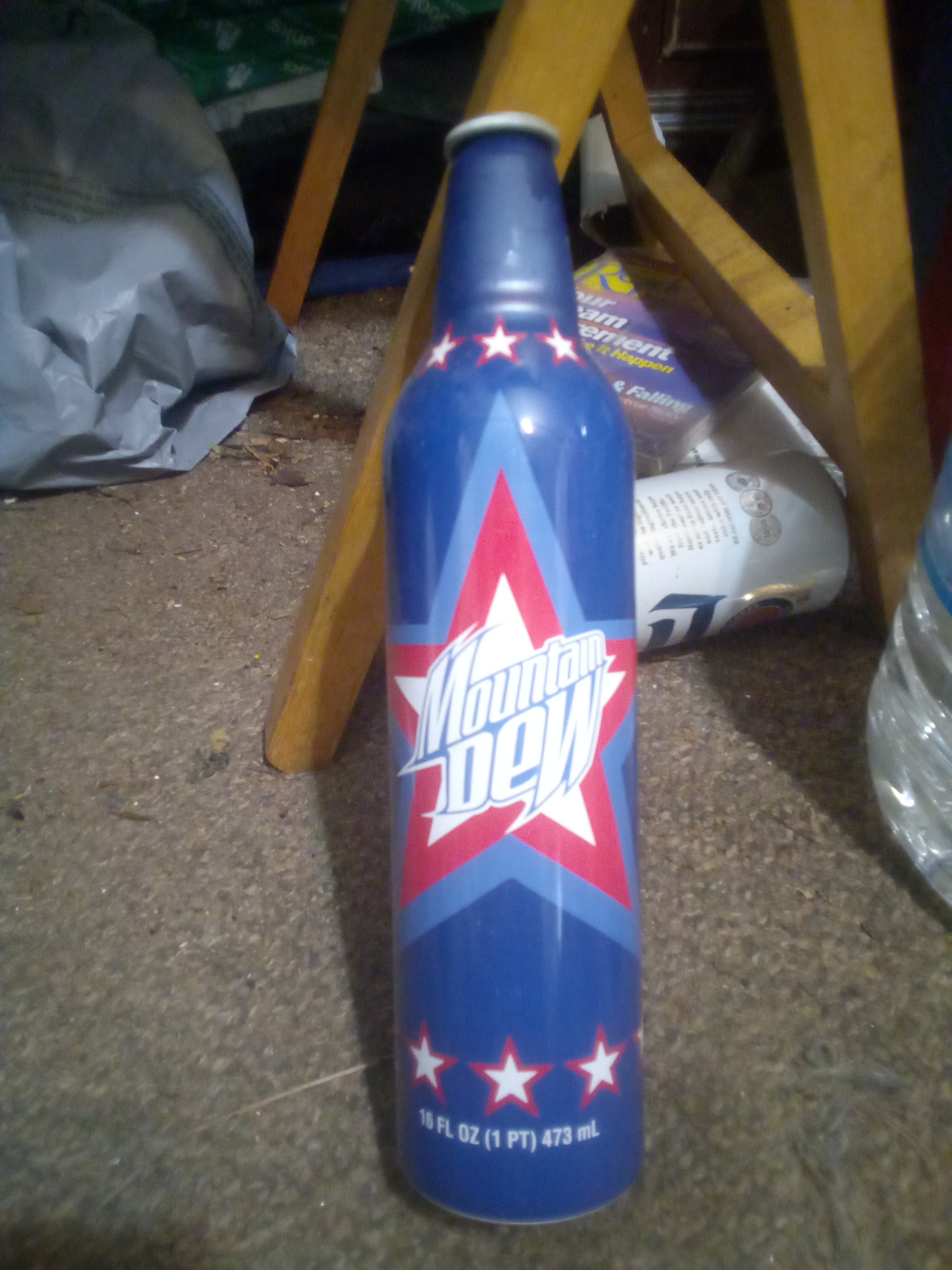 Physical Description: This is a custom aluminum bottle for Mountain Dew, measuring approximately 10 to 12 inches tall with a round diameter of 2 inches. The bottle features a prominent Mountain Dew logo, highlighted by a red star design and blue background. The bottle is designed for a 16 FL OZ (1 PT) capacity, indicating it originally held a beverage.