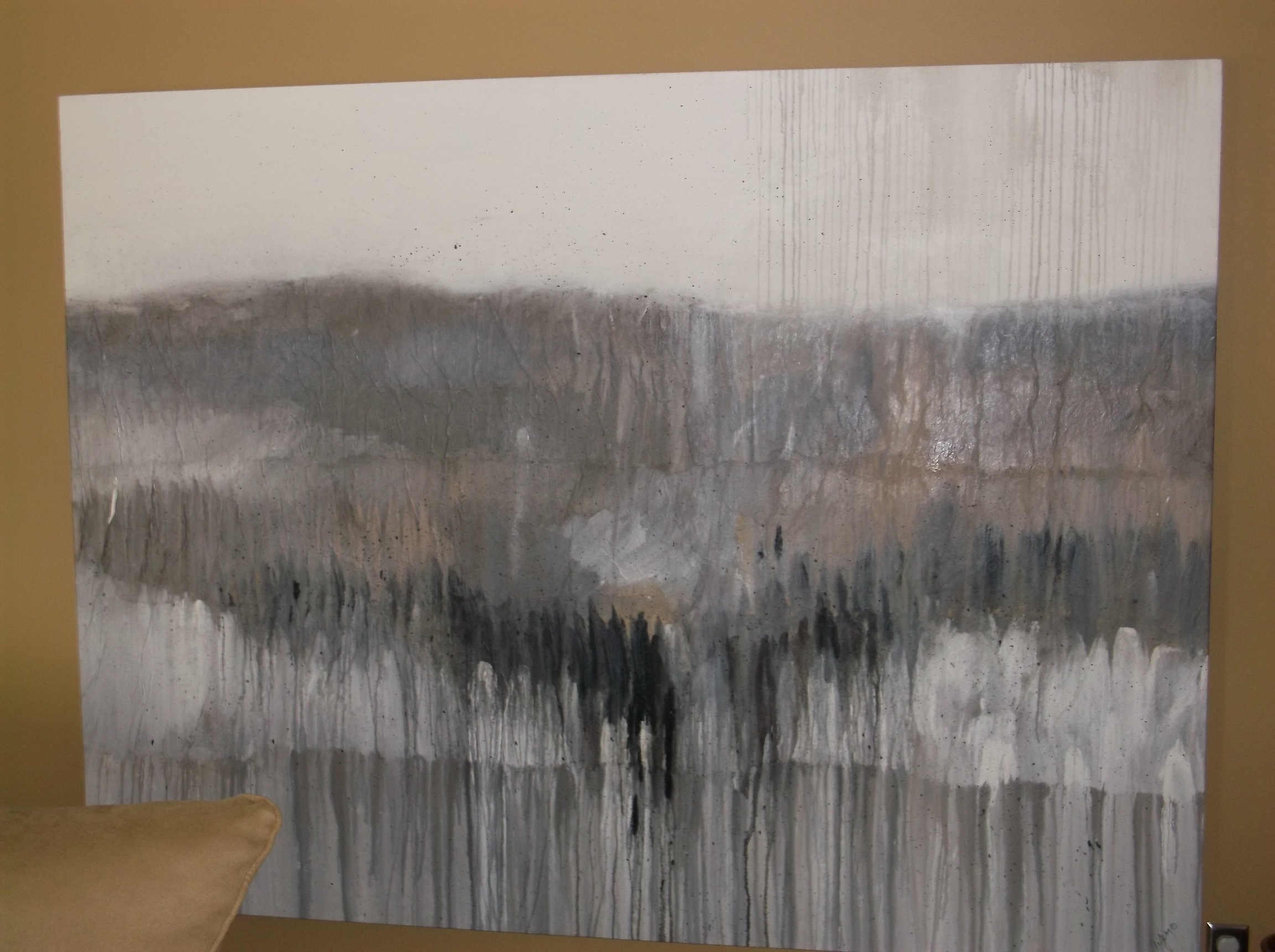 Approx 6.5' x 5' Oil Painting. Abstract Landscape in browns, greys, black and whites. Scene of mountains in rain.
