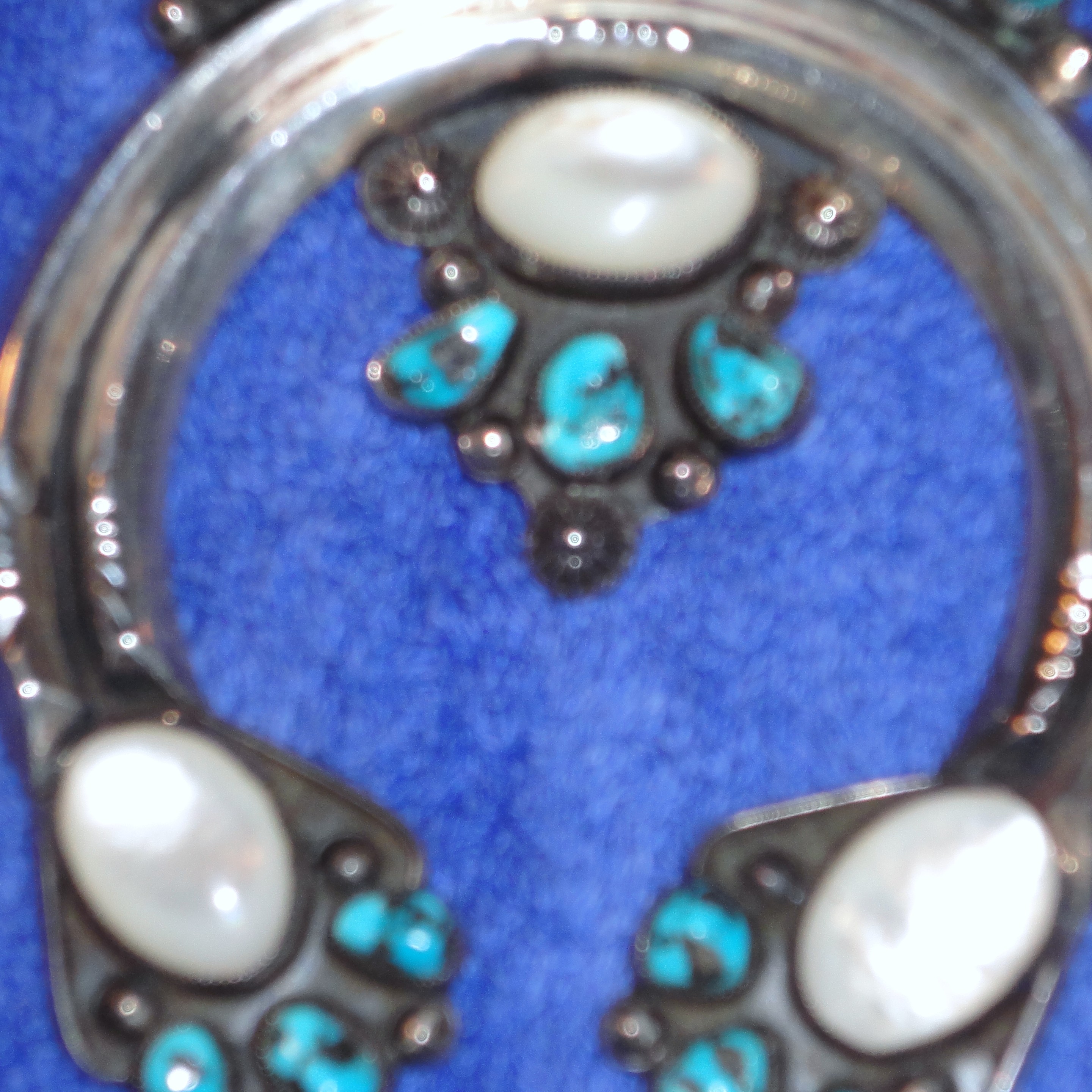 Large Mother of pearl bead in each of the blossoms, with three turquoise stones surrounding itl It is the same on the crest.