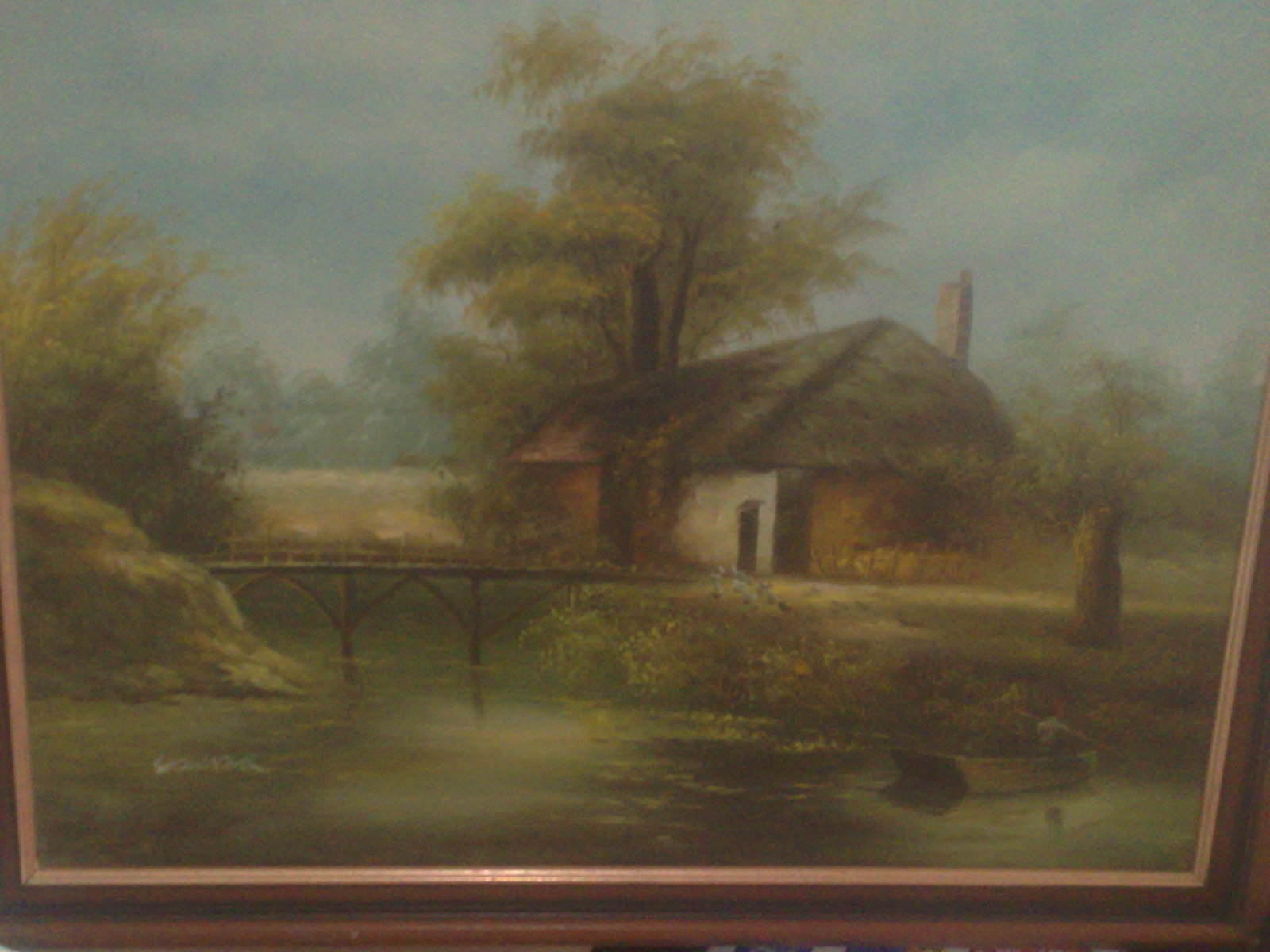 painting of a cottage surrounded by a lake