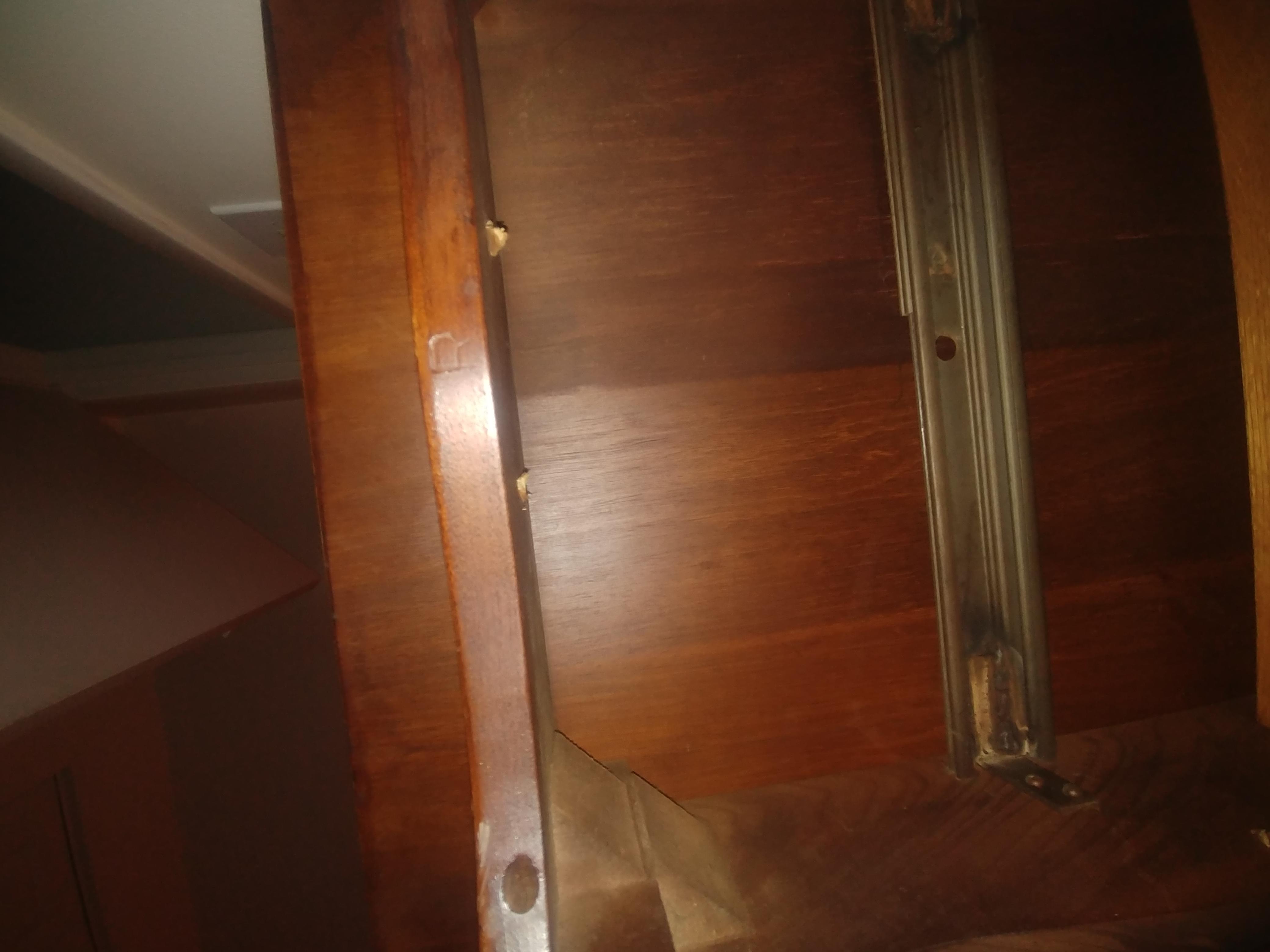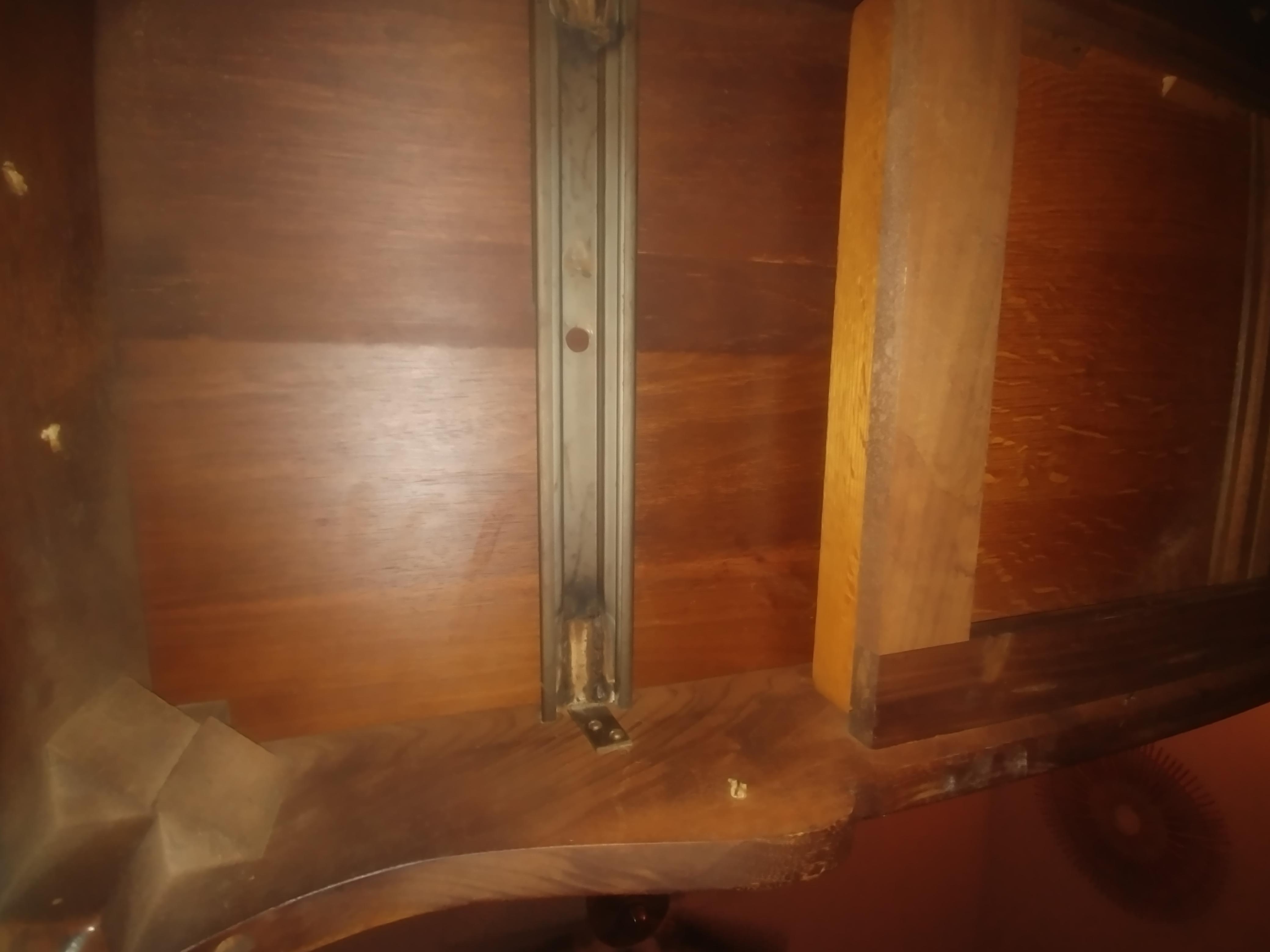 The table is designed to fold open into a larger dining table on sliding rails. It has spring loaded pins that lock the table in place on both sides.
