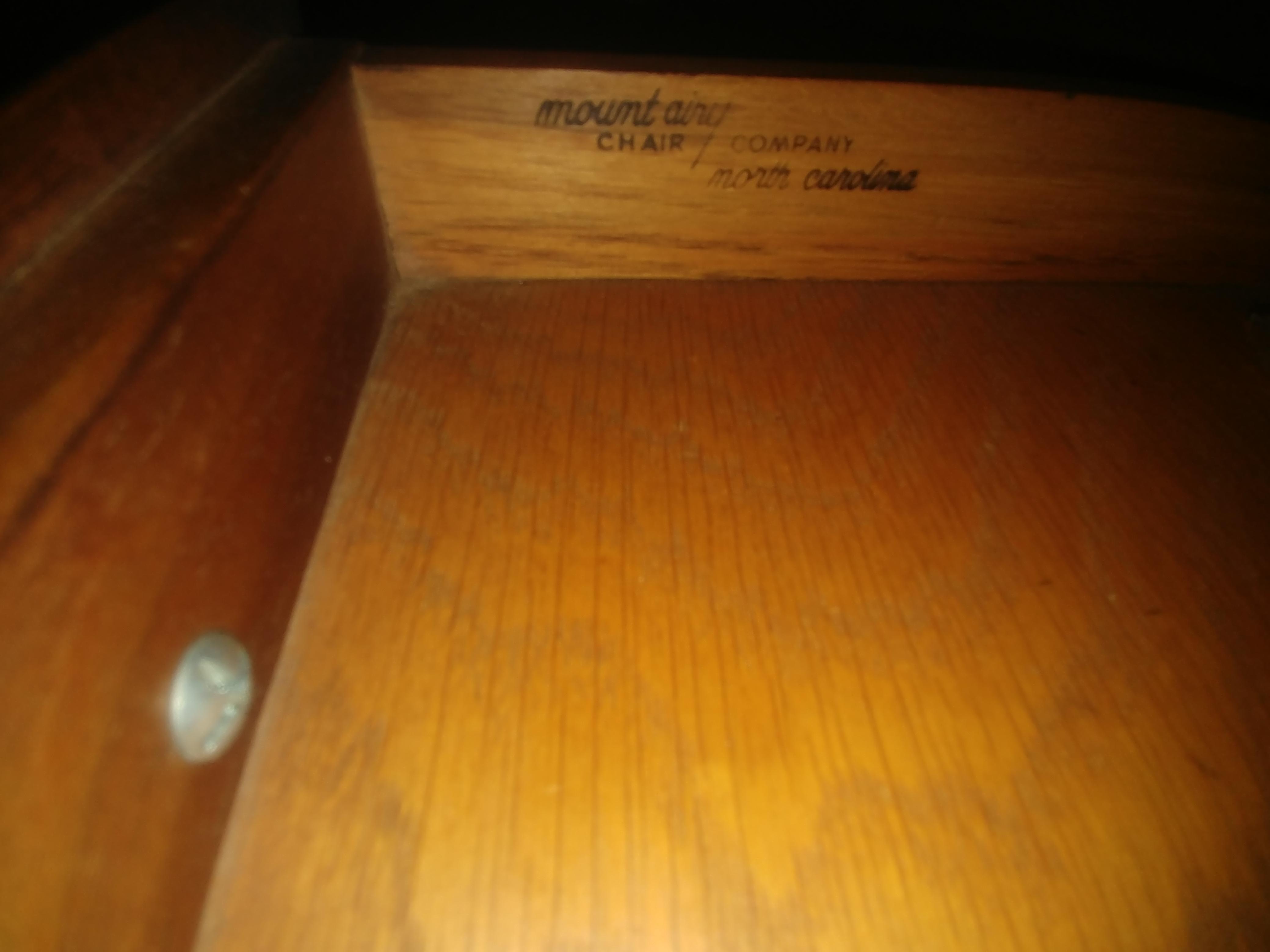 The letter R is stamped twice on the table. Mt Airy Chair Company label on inside of draw. And 2439 TABLE is painted on the underside of the table.