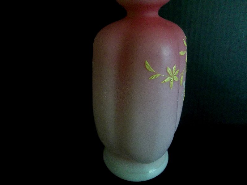 This is what is believed to be a very rare Mt. Washington peach blow wer. It stands 10.5 inches tall. It is in excellent condition with no chips, cracks, or other damage nor flaws. Polished pontil