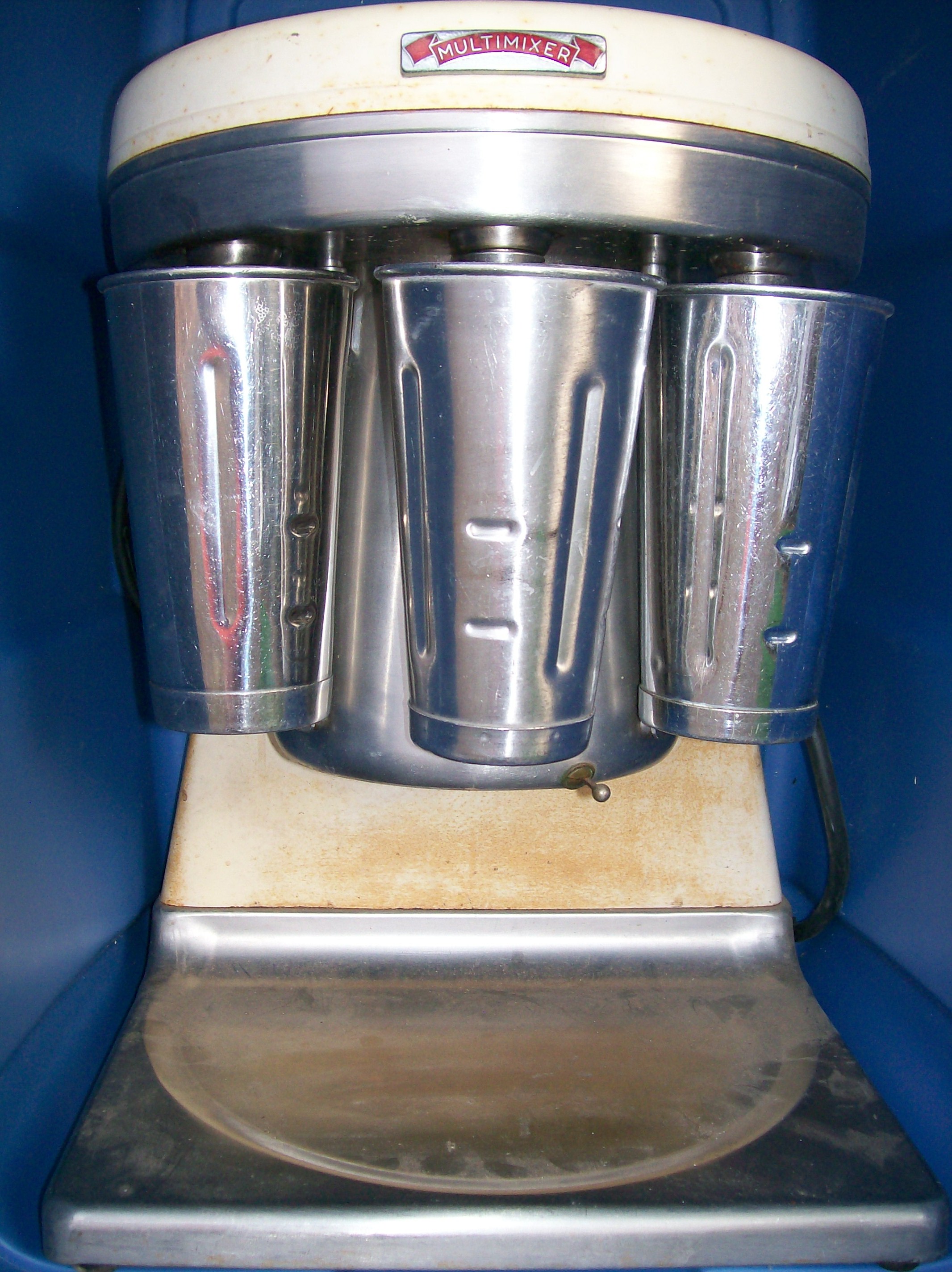 This is an electric 3 cup mixer. It has 3 mixers on this unit, with 3 large metal mixing cups. It is gold colored, with some fading and a small amount of surface rust.